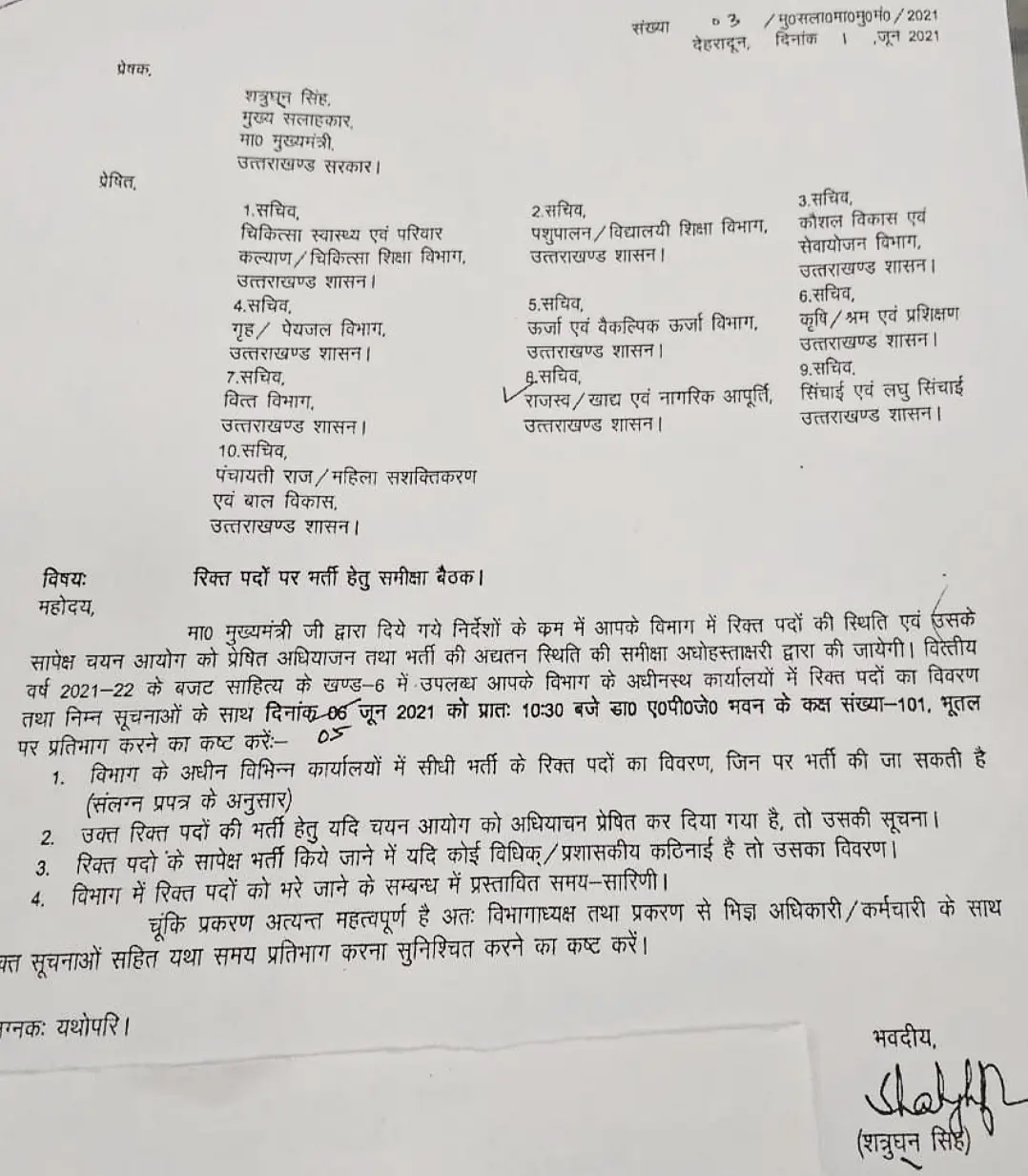 मुख्यमंत्री के मुख्य सलाहकार व पूर्व मुख्य सचिव शत्रुघ्न सिंह आज सचिवालय में अधिकारियों की बैठक लेने वाले हैं इस बैठक में अलग अलग विभागों के केवल 10 सचिव हिस्सा लेंगे !!