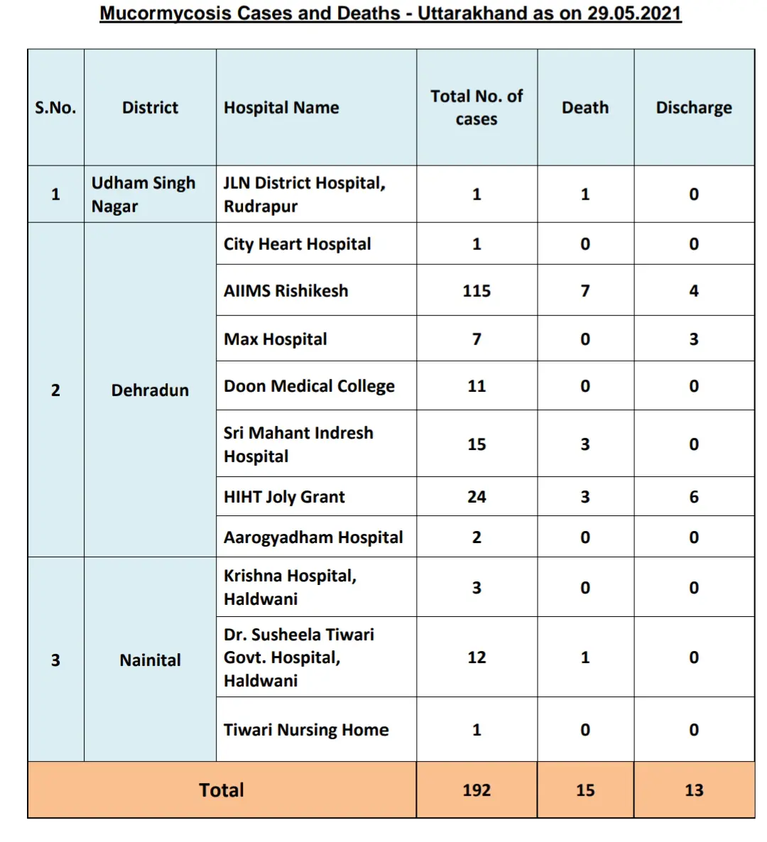 उत्तराखंड में अभी तक ब्लैक फंगस के कुल 192 मामले सामने आए हैं, जिनमे से 15 लोगों की मौत हो चुकी है और 13 लोग स्वस्थ हो गए हैं ।