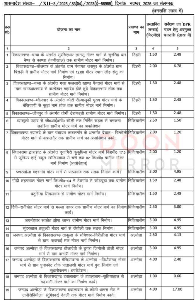 उत्तराखंड सरकार ने ‘मुख्यमंत्री ग्राम संपर्क योजना’ के तहत वित्तीय वर्ष 2025-26 में ग्रामीण संपर्क बढ़ाने के लिए बड़ा कदम उठाया है। शासन ने 24 नई ग्रामीण सड़क निर्माण योजनाओं को सैद्धांतिक एवं डीपीआर तैयार करने हेतु प्रशासनिक स्वीकृति प्रदान कर दी है।