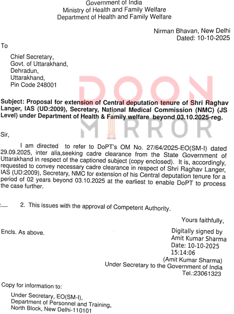 2009 बैच के उत्तराखंड कैडर के IAS अधिकारी राघव लंघर प्रतिनियुक्ति अवधि पूर्ण करने के बाद भी फिलहाल उत्तराखंड वापस आने के मूड में नजर नहीं आ रहे हैं। उन्होंने केंद्रीय प्रतिनियुक्ति को 2 वर्ष और आगे बढ़ाने का आग्रह DOPT को किया है। जिस क्रम में अब DOPT ने उत्तराखंड सरकार से कैडर क्लेरेंस (NOC) मांगी है। माना जा रहा है कि उत्तराखंड सरकार जल्द ही राघव लंघर को NOC भी दे देगी। जिस क्रम में वह और अगले 2 वर्ष के लिए केंद्रीय प्रतिनियुक्ति पर बरकरार रह पाएंगे।