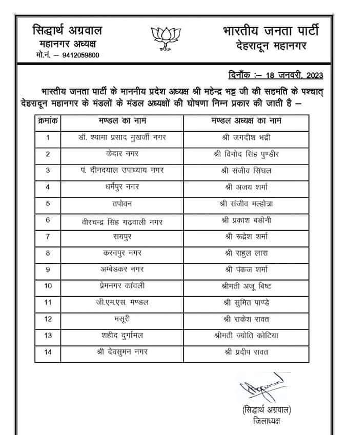 भाजपा ने देहरादून में अपने मंडल अध्यक्षों की करी घोषणा, इन कार्यकर्ताओं की खुली किस्मत !!