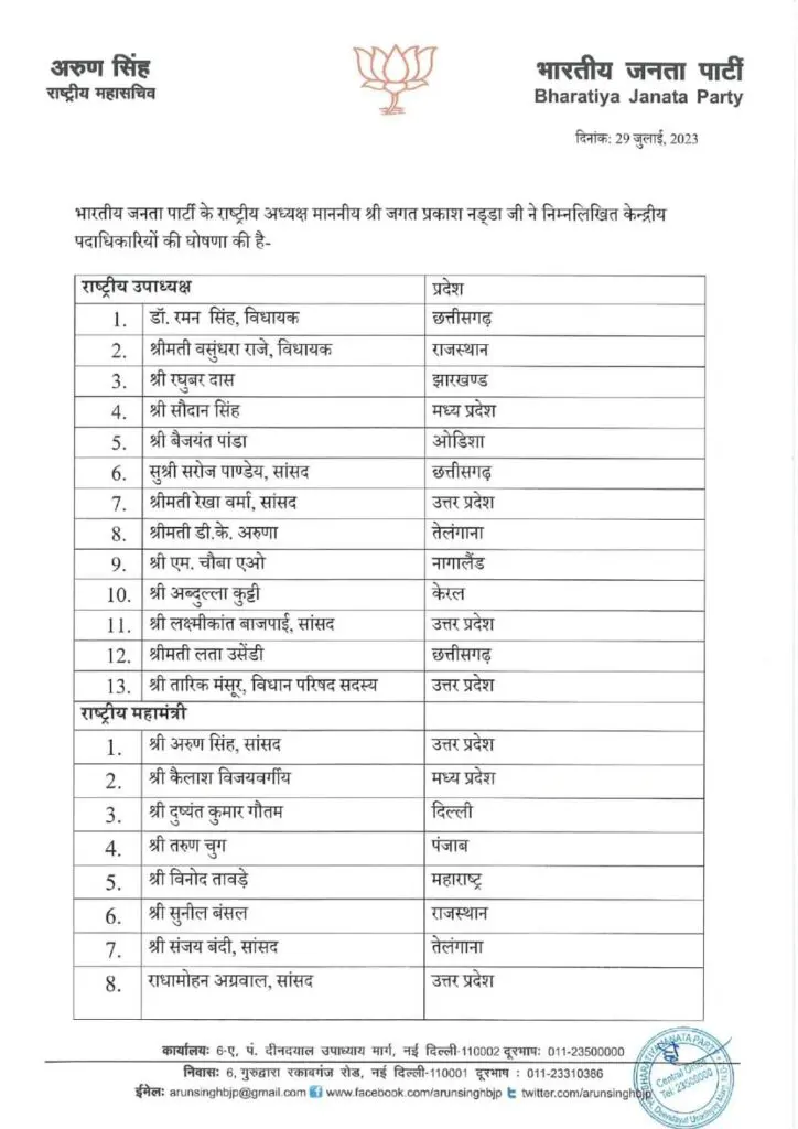 भाजपा ने करी अपनी नई केंद्रीय टीम की घोषणा !!