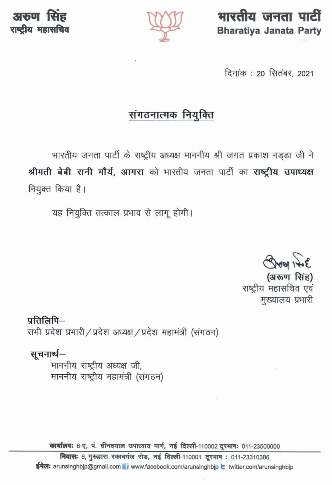 पूर्व राज्यपाल बेबी रानी मौर्य को केंद्रीय भाजपा संगठन ने दी बड़ी जिम्मेदारी