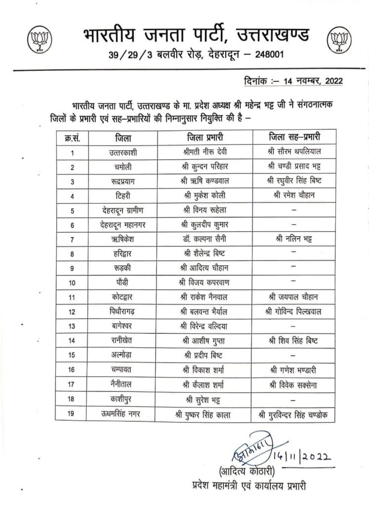 भाजपा ने जिलों में तैनात किए प्रभारी व सह-प्रभारी !! PoliticsUttarakhand Posted on November 14, 2022November 14, 2022भाजपा ने जिलों में तैनात किए प्रभारी व सह-प्रभारी !!Share this… Facebook Twitter WhatsappShantanu BishtEditor By Shantanu Bisht