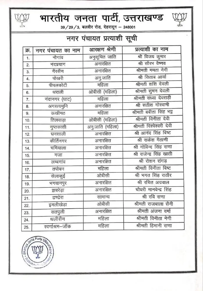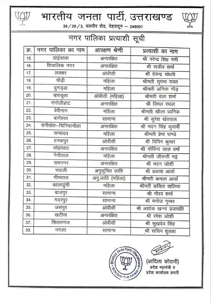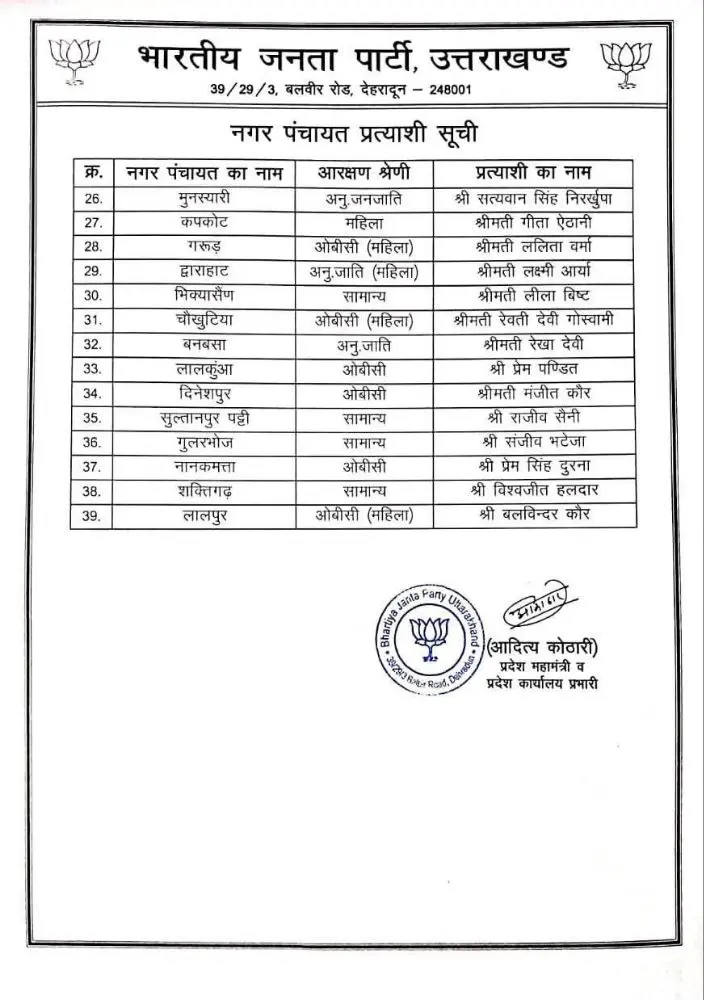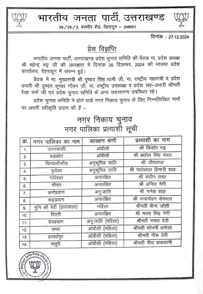 भाजपा ने जारी करी प्रत्याशियों की पहली सूची !! PoliticsUttarakhand Posted on December 27, 2024December 27, 2024Share this… Facebook Twitter WhatsappShantanu BishtEditor By Shantanu Bisht