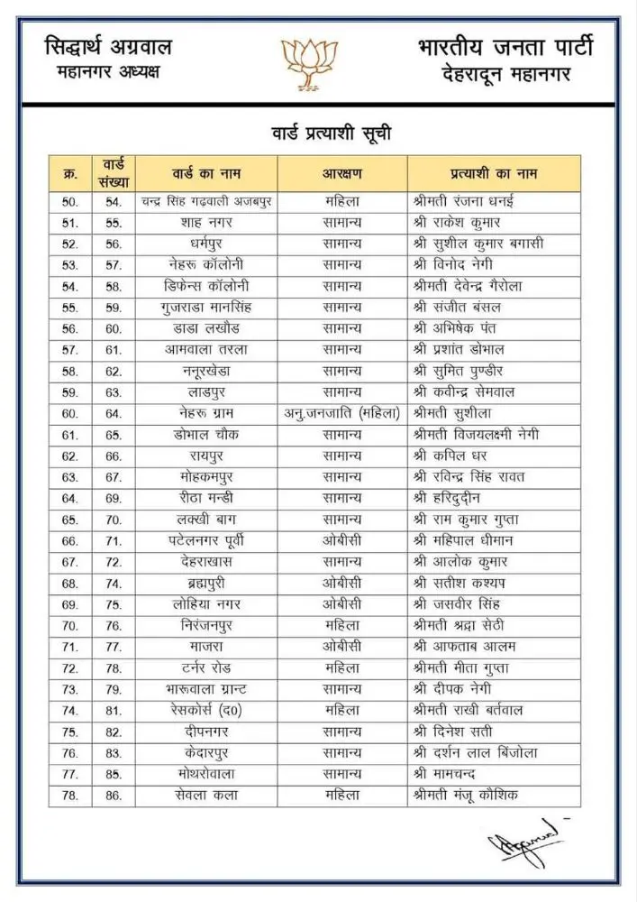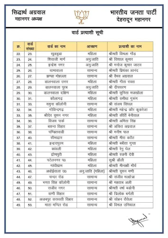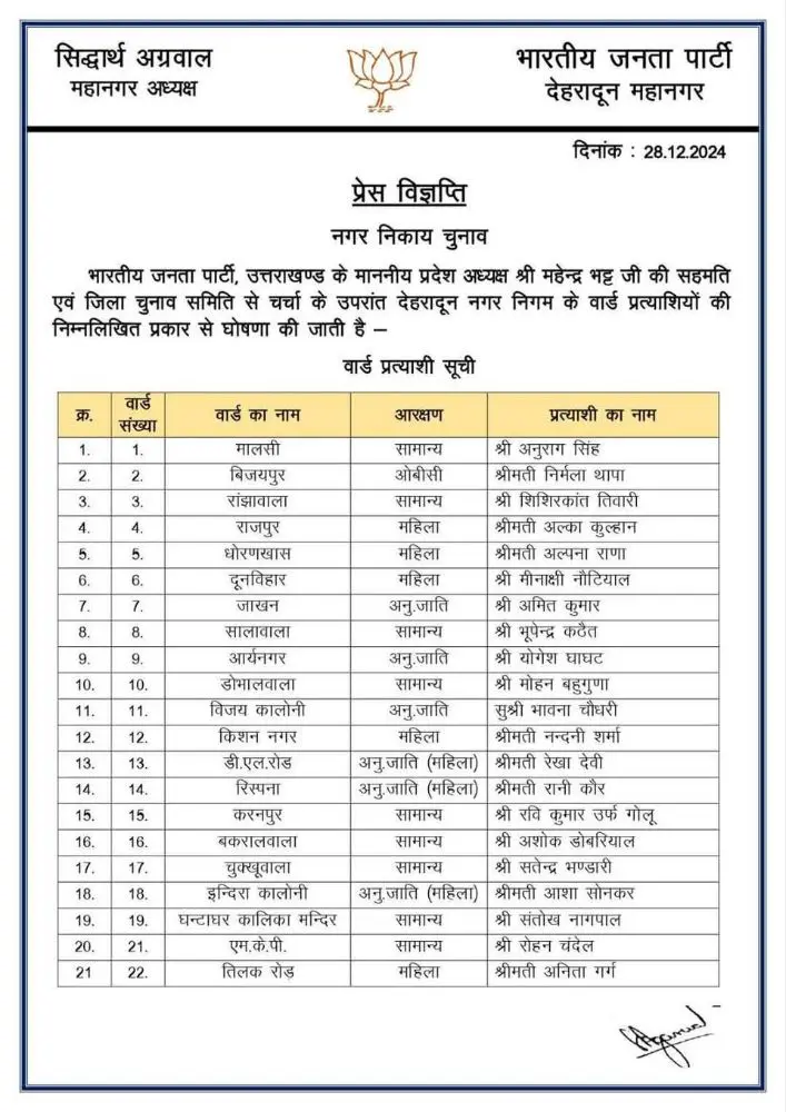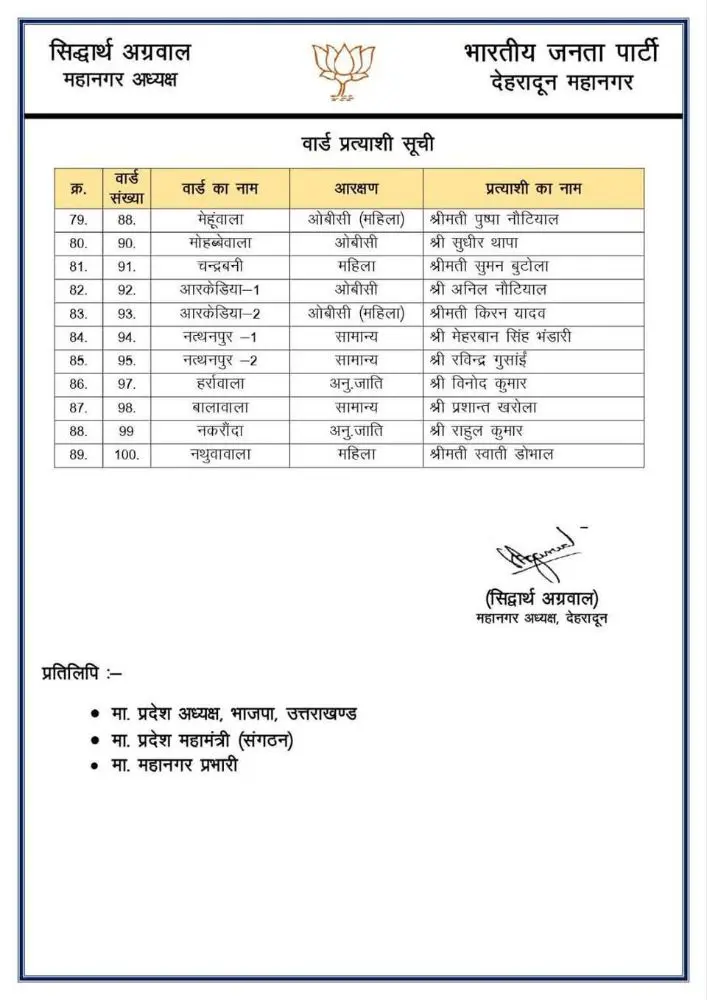 भाजपा ने जारी करी देहरादून के पार्षद प्रत्याशियों की सूची, वंही 100 में से 11 वार्डों पर प्रत्याशियों की घोषणा होनी अभी शेष !!