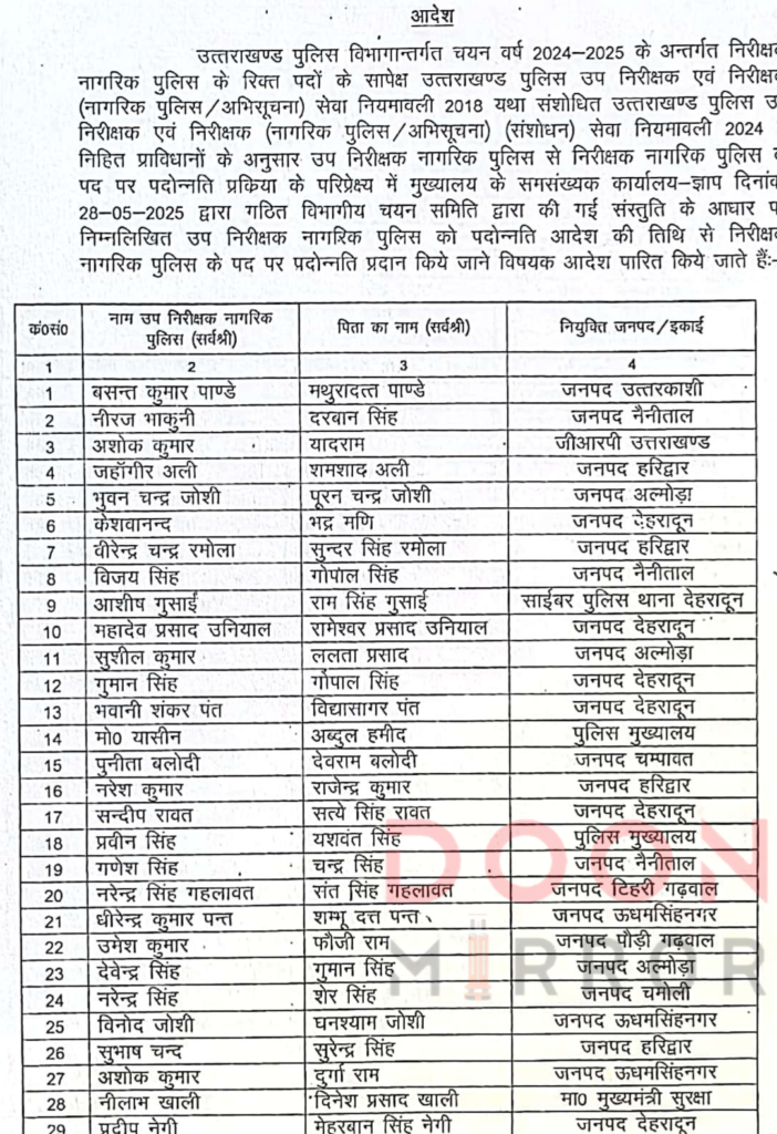 पुलिस विभाग में हुए बम्पर प्रोमोशन, 57 दरोगा हुए इंसपेक्टर पद पर पदोन्नत !! AdministrationUttarakhand Posted on May 31, 2025May 31, 2025पुलिस विभाग में हुए बम्पर प्रोमोशन, 57 दरोगा हुए इंसपेक्टर पद पर पदोन्नत !!Share this… Facebook Twitter WhatsappShantanu BishtEditor By Shantanu Bisht
