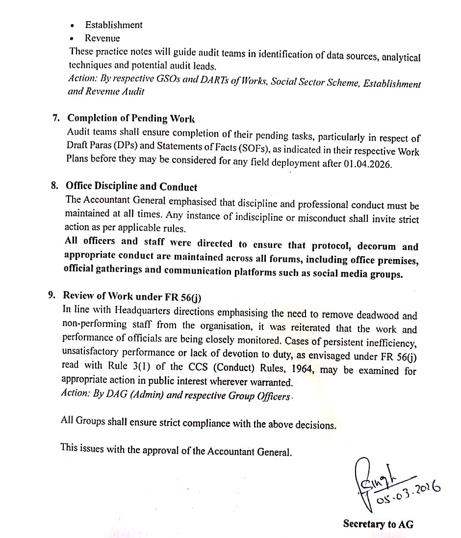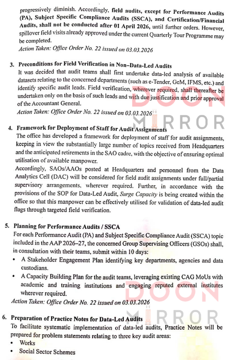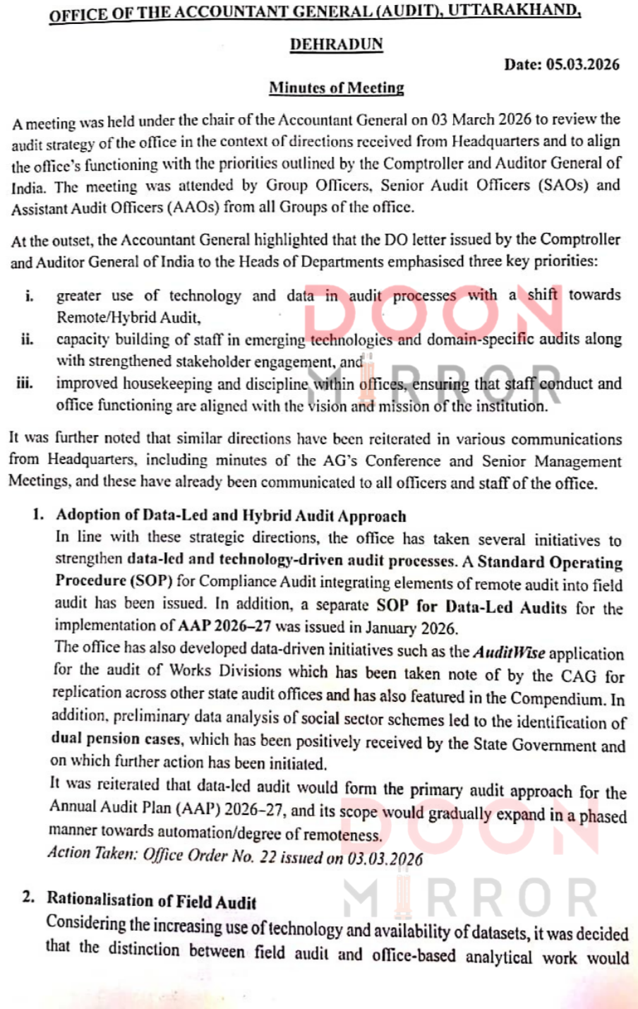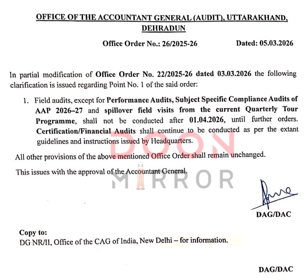 भारत के नियंत्रक एवं महालेखा परीक्षक (CAG) के निर्देशों के तहत महालेखाकार (ऑडिट) उत्तराखंड कार्यालय ने ऑडिट कार्यप्रणाली में बदलाव करते हुए फील्ड ऑडिट को सीमित करने का निर्णय लिया है। जारी कार्यालय आदेश के अनुसार 1 अप्रैल 2026 से परफॉर्मेंस ऑडिट, सब्जेक्ट स्पेसिफिक कम्प्लायंस ऑडिट और सर्टिफिकेशन/फाइनेंशियल ऑडिट को छोड़कर अन्य फील्ड ऑडिट नहीं किए जाएंगे।