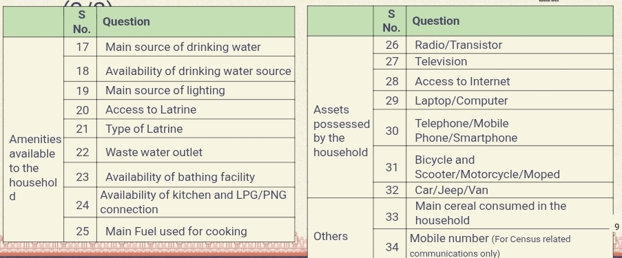 जनगणना के दौरान आवास, सुविधाओं और परिसंपत्तियों से जुड़े 33 प्रमुख प्रश्नों के आधार पर जानकारी जुटाई जाएगी, जो भविष्य की योजनाओं और नीतियों के लिए अहम होगी।