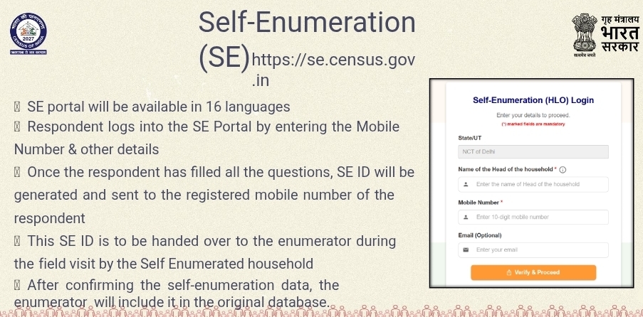 इससे पहले 10 से 24 अप्रैल तक प्रदेशवासियों को स्व-गणना का अवसर दिया गया है। लोग http://se.census.gov.in पोर्टल पर लॉगिन कर मोबाइल नंबर के जरिए स्वयं अपना डेटा दर्ज कर सकते हैं। बस जब जनगणना कर्मी आपके दरवाजे पर आएं तो मोबाइल नम्बर पर आए SE ID को शेयर करें।