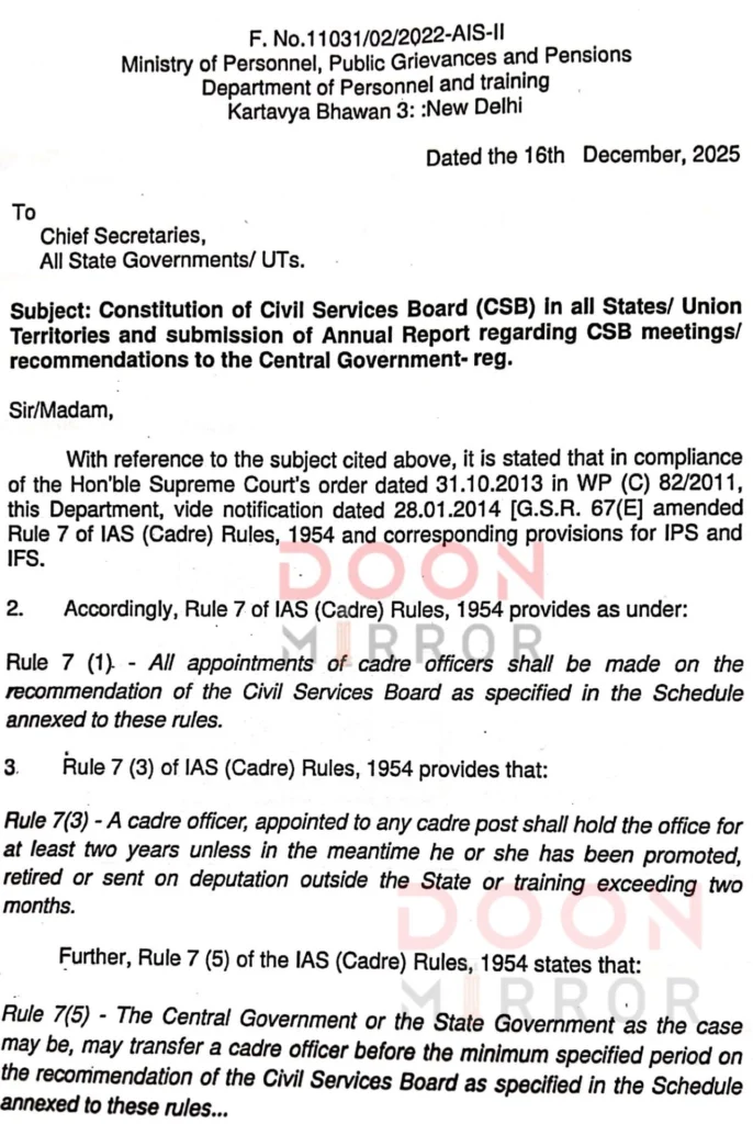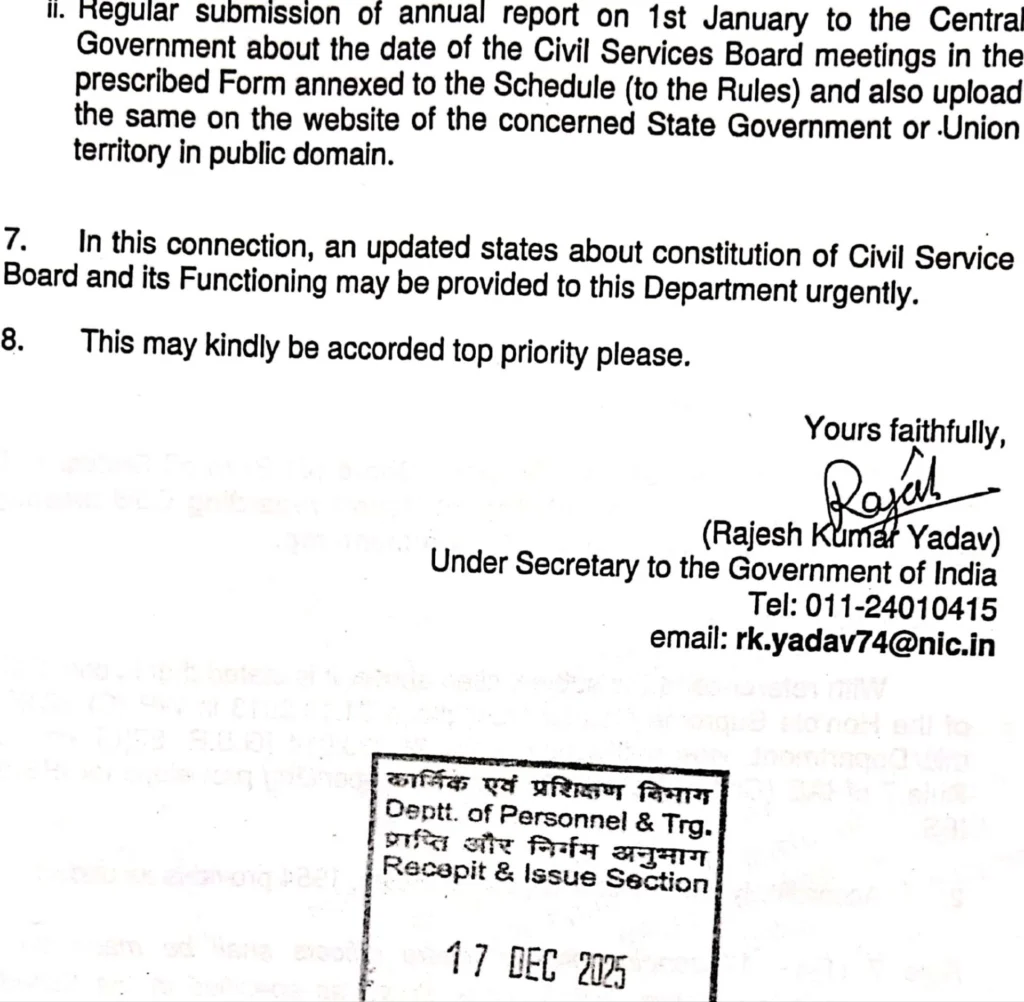 पत्र में राज्यों से सिविल सर्विसेज बोर्ड के गठन और उसके कार्य संचालन की अद्यतन स्थिति शीघ्र उपलब्ध कराने को कहा गया है। केंद्र सरकार ने इस मामले को सर्वोच्च प्राथमिकता देने के निर्देश दिए हैं।