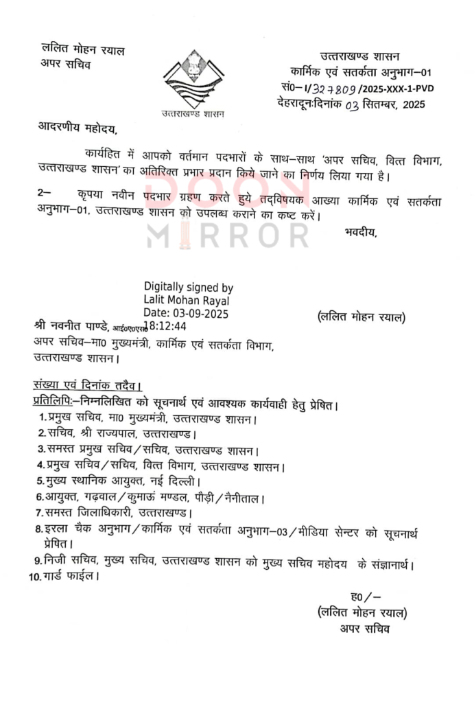 उत्तराखंड शासन में अपर सचिव रैंक पर कार्यरत IAS अधिकारी नवनीत पाण्डे की जिम्मेदारी में बदलाव हुआ है, उन्हें अब अपर सचिव मुख्यमंत्री, कार्मिक एवं सतर्कता के साथ साथ अब अपर सचिव वित्त की भी जिम्मेदारी दी गयी है।
