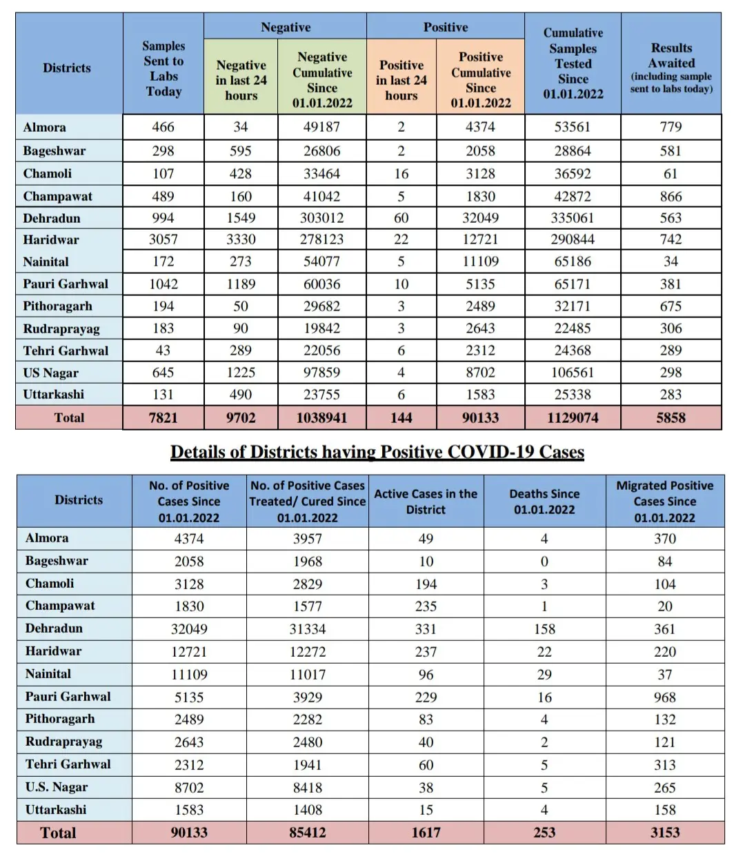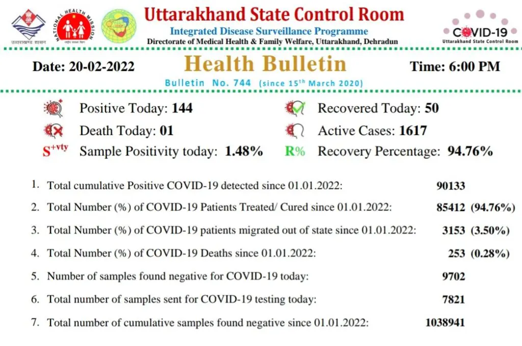 उत्तराखंड में कोरोना के 144 नए मरीज मिले और एक संक्रमित की मौत हो गई। इसके साथ ही राज्य में कोरोना की तीसरी लहर में कुल मरीजों की संख्या 90 हजार को पार कर गए हैं।