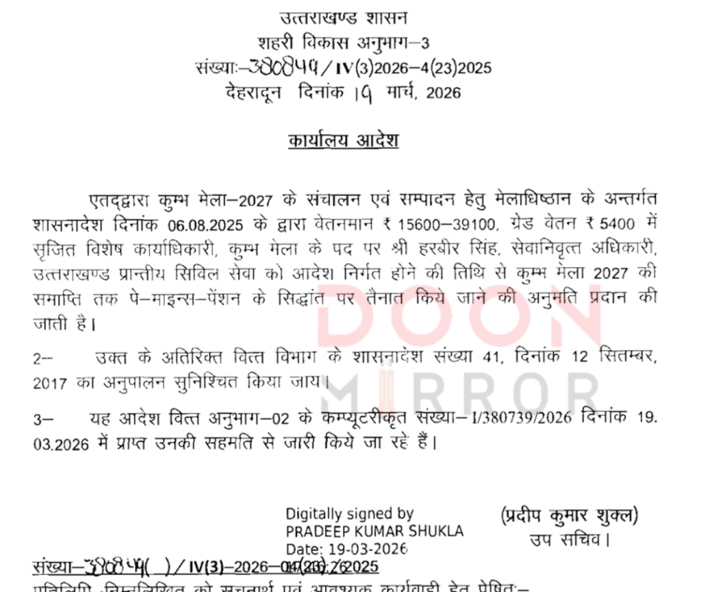 धामी सरकार ने आगामी कुम्भ मेला 2027 की तैयारियों को लेकर बड़ा फैसला लिया है। शहरी विकास विभाग द्वारा जारी कार्यालय आदेश के अनुसार, पूर्व पीसीएस अधिकारी हरवीर सिंह को कुम्भ मेला-2027 के सफल संचालन एवं व्यवस्थापन के लिए विशेष कार्याधिकारी के पद पर तैनात किया गया है। उन्हें पे माइनस पेंशन के आधार पर नियुक्त करते हुए मेला समाप्ति तक जिम्मेदारी सौंपी गई है। माना जा रहा है कि इस फैसले से कुम्भ मेले की तैयारियों को गति मिलेगी और व्यवस्थाओं को बेहतर ढंग से संचालित किया जा सकेगा।