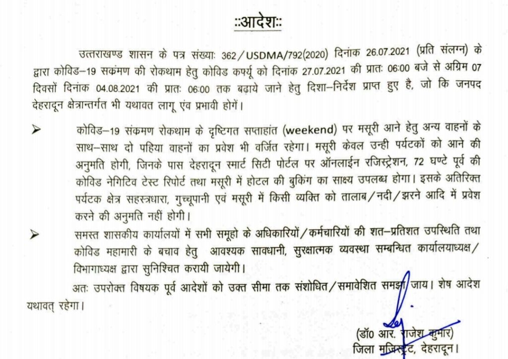 मसूरी जाने वाले पर्यटकों के लिए जिला अधिकारी ने जारी की नई गाईडलाइन !! AdministrationDehradun Posted on July 27, 2021July 27, 2021मसूरी जाने वाले पर्यटकों के लिए जिला अधिकारी ने जारी की नई गाईडलाइन !!Share this… Facebook Twitter WhatsappShantanu BishtEditor By Shantanu Bisht