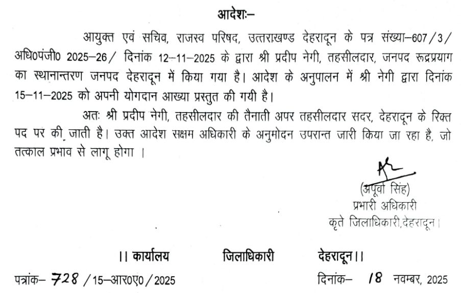 DM देहरादून ने रुद्रप्रयाग से जनपद देहरादून में स्थानांतरित हुए तहसीलदार प्रदीप नेगी को दी सदर तहसील की जिम्मेदारी, आदेश हुए जारी !!
