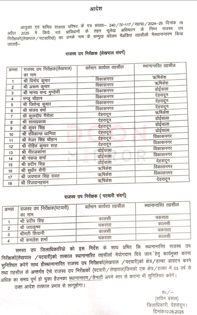 DM देहरादून ने किए पटवारियों व लेखपालों के बम्पर तबादले !! AdministrationDehradun Posted on June 11, 2025June 11, 2025DM देहरादून ने किए पटवारियों व लेखपालों के बम्पर तबादले !!Share this… Facebook Twitter WhatsappShantanu BishtEditor By Shantanu Bisht