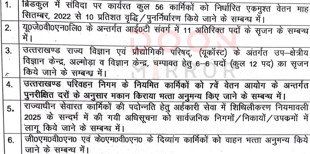 उत्तराखंड के सरकारी एवं सार्वजनिक निगमों, उपक्रमों एवं स्वायत्तशासी संस्थानों के कर्मचारियों को विभिन्न लाभ देने संबंधित प्रकरणों का निस्तारण हेतु मुख्य सचिव की अध्यक्षता में 9 अक्टूबर को एक बैठक होने जा रही है। जिसमे निम्नलिखित 6 एजेंडे पर चर्चा होनी है। सब कुछ ठीक रहा तो इन 6 बिंदुओं व मांग पर राज्य सरकार की मुहर लग सकती है।