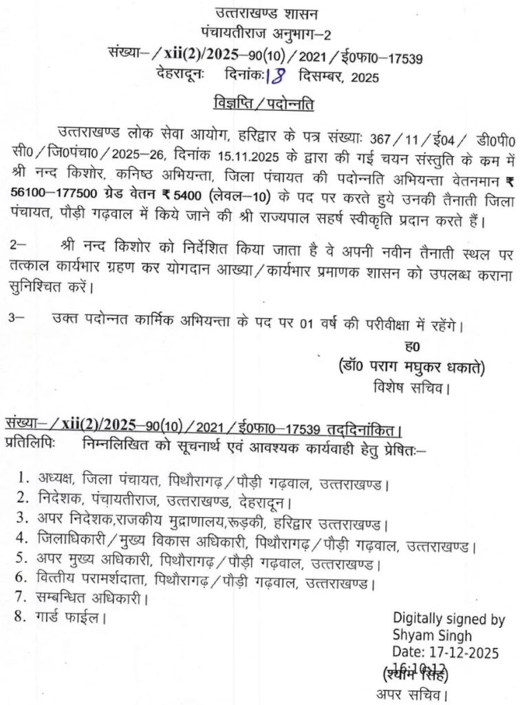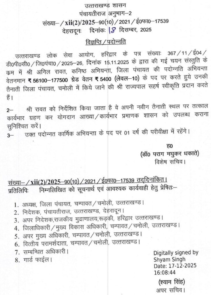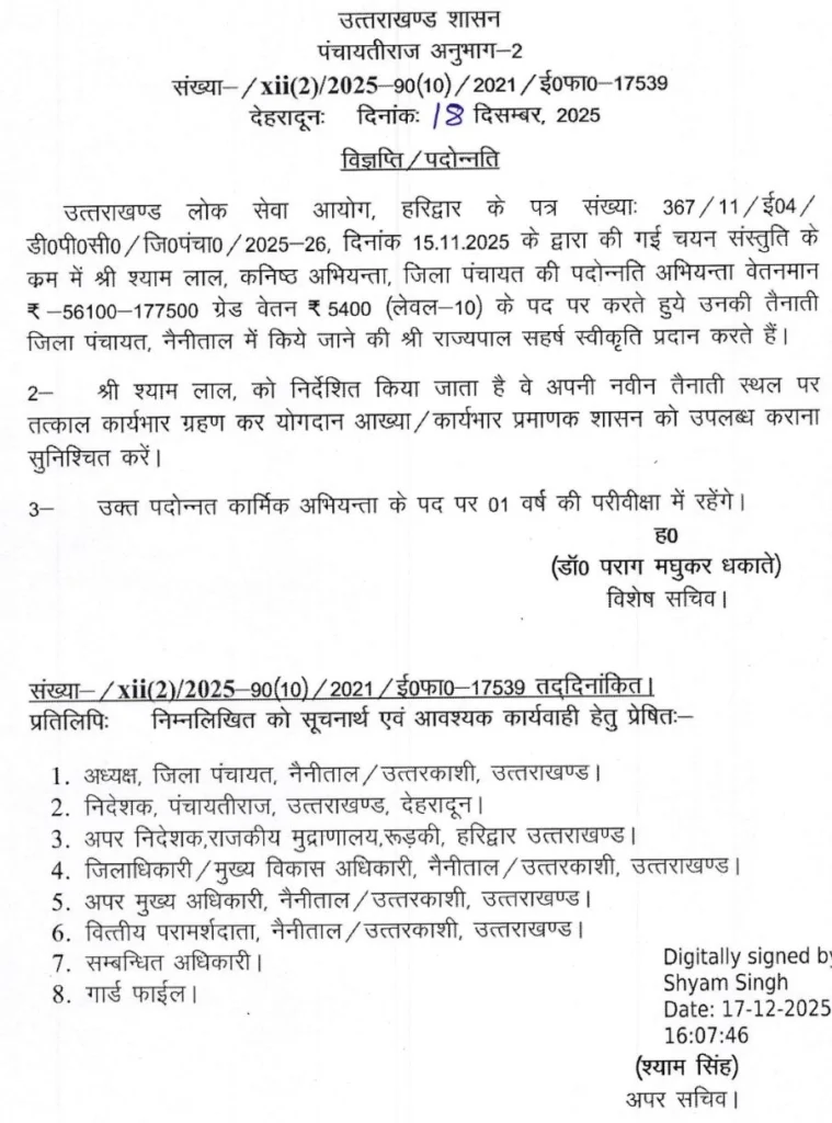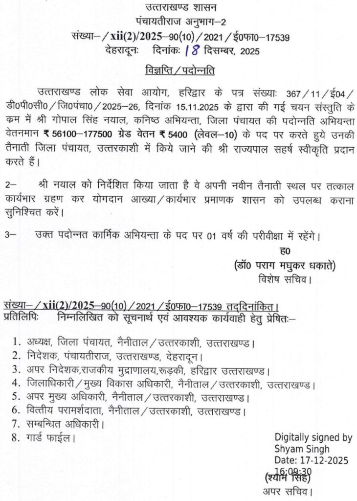 पदोन्नति के सापेक्ष पंचायतीराज विभाग में अभियंताओं को मिली नवीन तैनाती !! PrimeUttarakhand Posted on December 18, 2025December 18, 2025पदोन्नति के सापेक्ष पंचायतीराज विभाग में अभियंताओं को मिली नवीन तैनाती !!Share this… Facebook Twitter WhatsappShantanu BishtEditor By Shantanu Bisht
