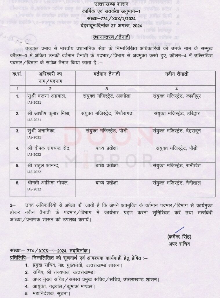 आज उत्तराखंड शासन ने 2021 और 2022 बैच के 6 IAS अधिकारियों को नवीन तैनाती दी है।