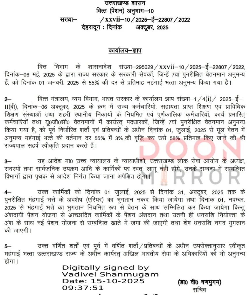 शासन ने जारी किया DA बढ़ोतरी व दीवाली बोनस का आदेश !! PrimeUttarakhand Posted on October 15, 2025October 15, 2025शासन ने जारी किया DA बढ़ोतरी व दीवाली बोनस का आदेश !!Share this… Facebook Twitter WhatsappShantanu BishtEditor By Shantanu Bisht