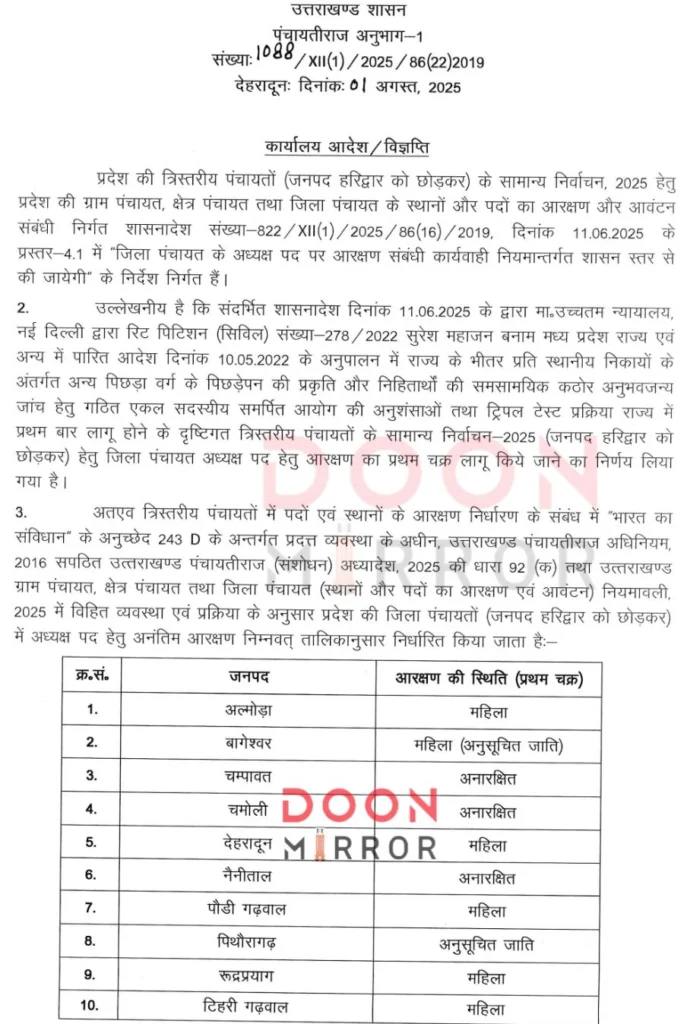 शासन ने जारी करी जिला पंचायत अध्यक्षों के लिए अनंतिम आरक्षण सूची !! PoliticsUttarakhand Posted on August 1, 2025August 1, 2025शासन ने जारी करी जिला पंचायत अध्यक्षों के लिए अनंतिम आरक्षण सूची !!Share this… Facebook Twitter WhatsappShantanu BishtEditor By Shantanu Bisht