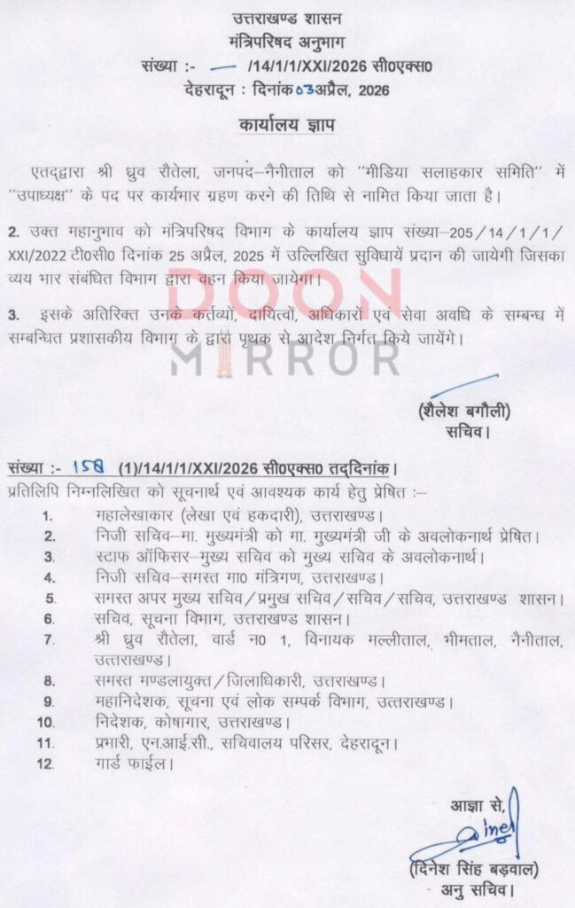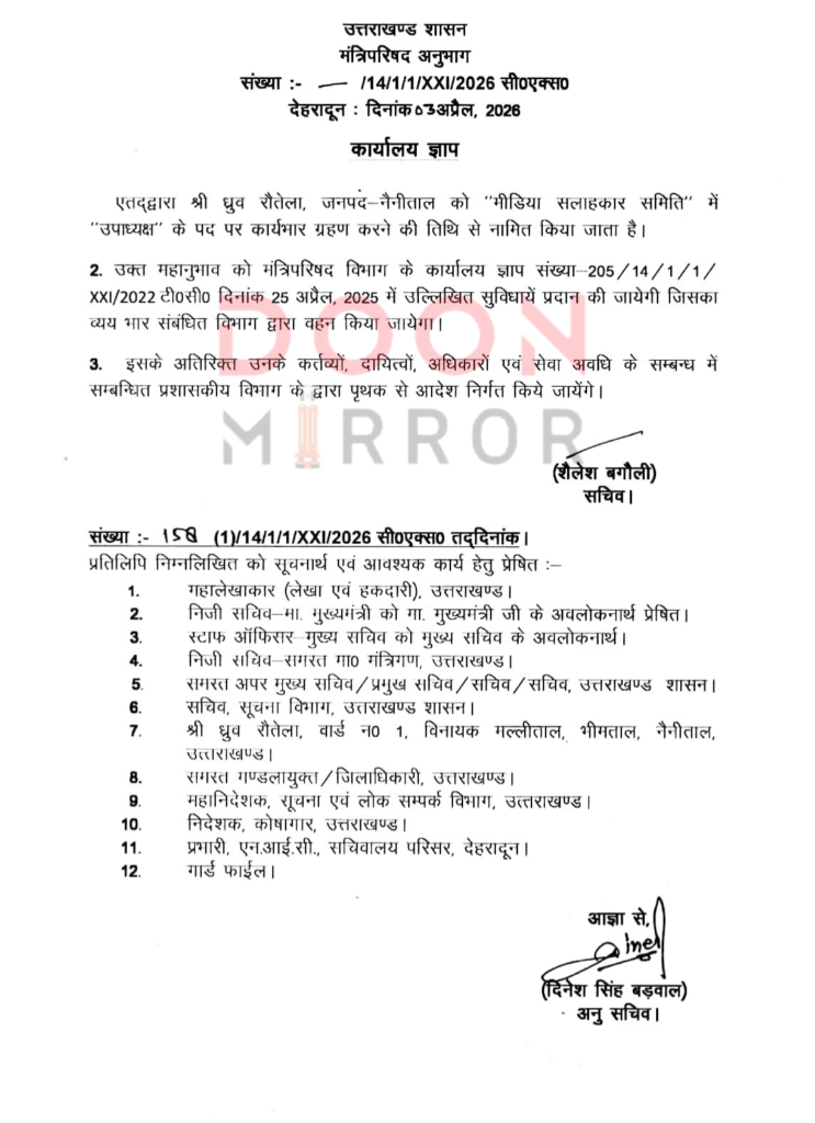 नैनीताल निवासी ध्रुव रौतेला को बनाया गया मीडिया सलाहकार समिति का उपाध्यक्ष, गोपन विभाग नर जारी किया आदेश !!