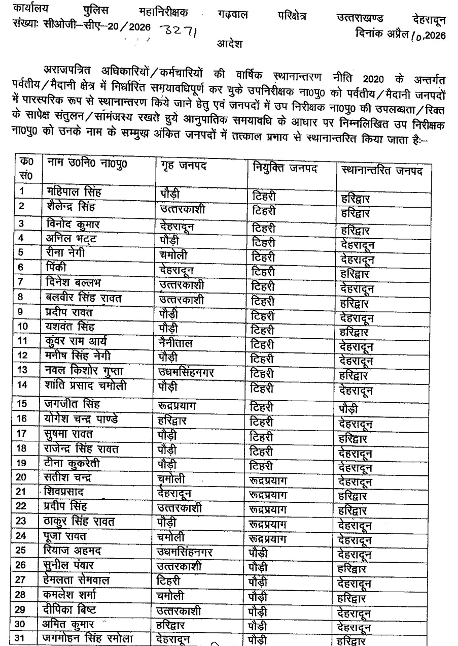 IG गढ़वाल ने किए 106 दरोगाओं के तबादले, जल्द होंगे रिलीव !! PrimeUttarakhand Posted on April 11, 2026April 11, 2026IG गढ़वाल ने किए 106 दरोगाओं के तबादले, जल्द होंगे रिलीव !!Share this… Facebook Twitter WhatsappShantanu BishtEditor By Shantanu Bisht