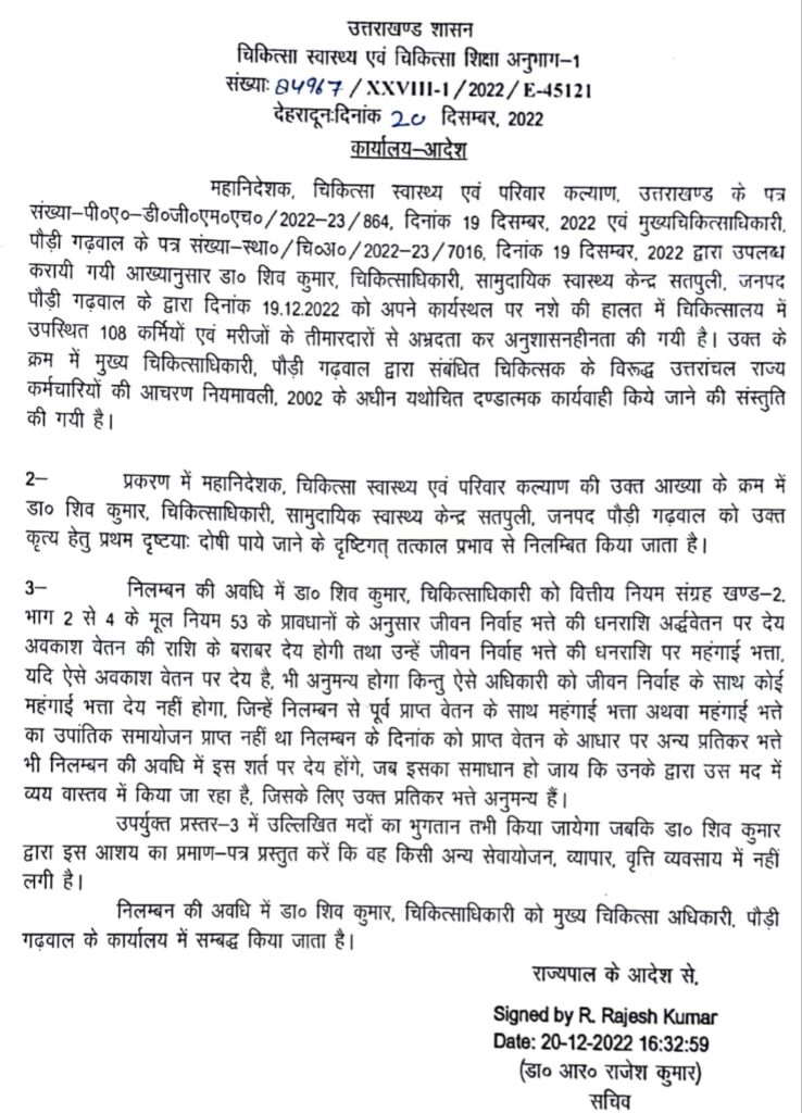 पौड़ी जनपद के सतपुली सामुदायिक स्वास्थ्य केंद्र के चिकित्साधिकारी निलंबित !!