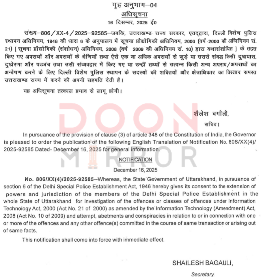 उत्तराखंड सरकार ने साइबर अपराधों की जांच को लेकर बड़ा और अहम फैसला लिया है। राज्य सरकार ने दिल्ली विशेष पुलिस स्थापना अधिनियम, 1946 की धारा-6 के तहत दिल्ली विशेष पुलिस स्थापना (CBI) को पूरे उत्तराखंड में अधिकार क्षेत्र बढ़ाने की सहमति दे दी है। इससे अब सूचना प्रौद्योगिकी अधिनियम, 2000 (IT ACT) के तहत दर्ज मामलों की जांच सीबीआई राज्यभर में कर सकेगी।