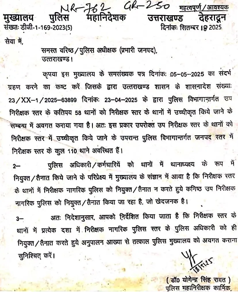 कुछ रोज पूर्व ही IG कार्मिक योगेंद्र रावत ने बाकायदा आदेश जारी कर समस्त कप्तानों को इंस्पेक्टर के थानों में निरीक्षक रैंक का ही अधिकारी नियुक्त करने के निर्देश दिए थे व अनुपालन आख्या भी पुलिस मुख्यालय को जमा करवाने के लिए आदेश जारी किए गए थे।