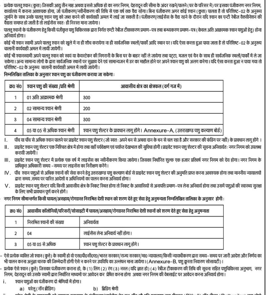 पंजीकरण से पूर्व उनका बधियाकरण और टीकाकरण आवश्यक है। इस संबंध में सोमवार को उपविधि का अनंतिम प्रकाशन कर दिया गया है। अब एक महीने तक दावे और आपत्तियां मांगी गई हैं, जिसके बाद इसे लागू किया जाएगा। आक्रामक नस्ल के कुत्तों के पंजीकरण में ज्यादा शुल्क के साथ कड़ी शर्तें लगाई गई हैं, जबकि लावारिस कुत्तों को गोद लेने पर पंजीकरण शुल्क माफ किया गया है। रात को पालतू कुत्ता भौंकने, खुले में शौच कराने और बिना पट्टे कुत्ते को सार्वजनिक स्थानों पर छोड़ने के मामले में कड़ी कार्रवाई की जाएगी। बार-बार शिकायत आने पर मुकदमा दर्ज कराने का प्रावधान है।