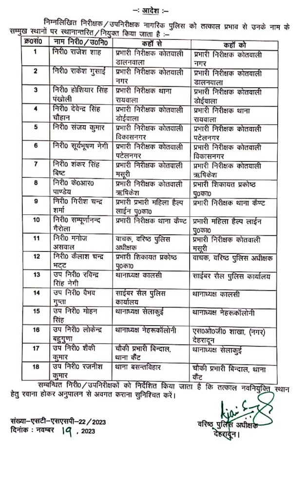 अब एसएसपी देहरादून में बदल दिए कई कोतवाल व थानाध्यक्ष !!