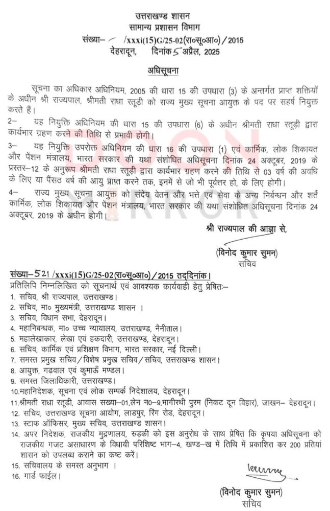 राधा रतूड़ी को बनाया गया मुख्य सूचना आयुक्त, आदेश हुए जारी !! PrimeUttarakhand Posted on April 5, 2025April 5, 2025पूर्व मुख्य सचिव राधा रतूड़ी को बनाया गया मुख्य सूचना आयुक्त, आदेश हुए जारी !!Share this… Facebook Twitter WhatsappShantanu BishtEditor By Shantanu Bisht