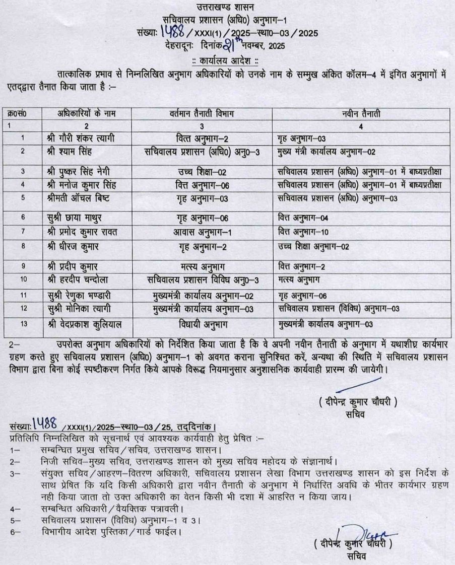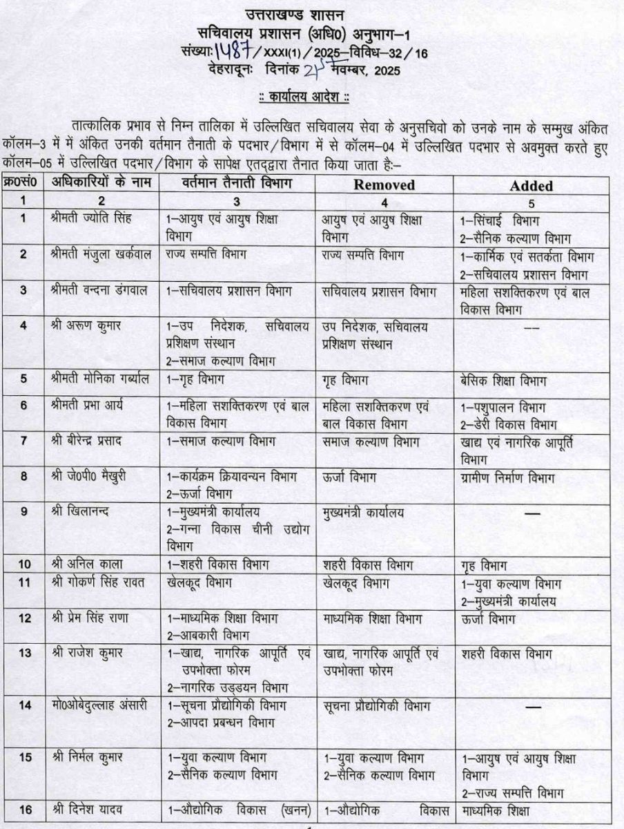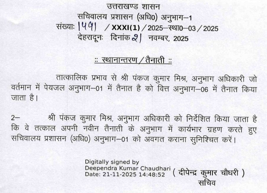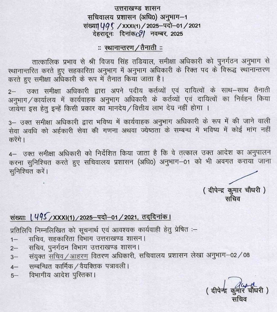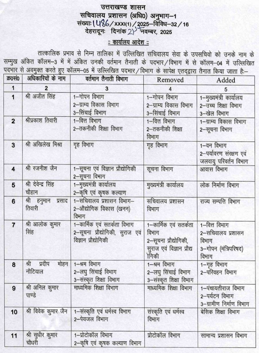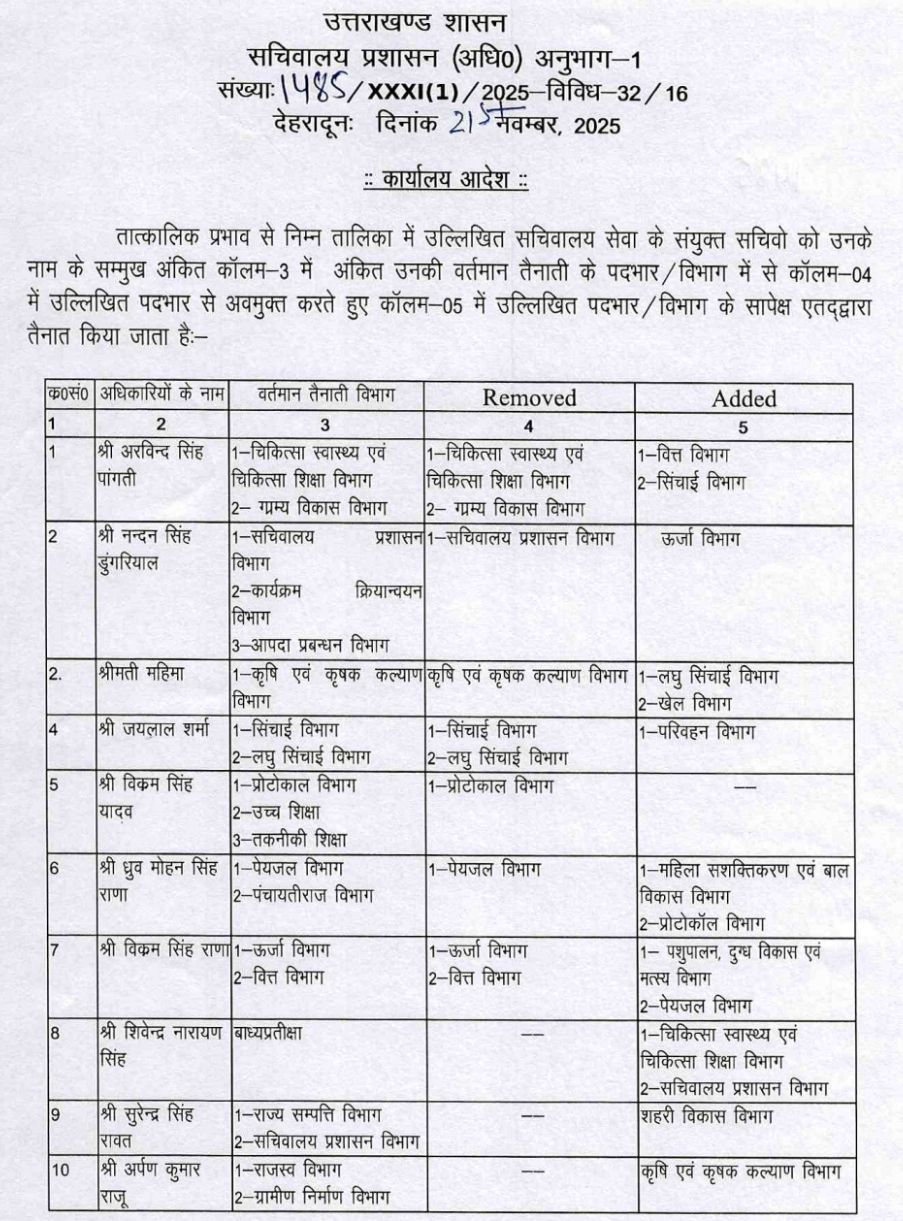 सचिवालय प्रशासन विभाग ने किये SO से लेकर संयुक्त सचिवों के बम्पर तबादले !! PrimeUttarakhand Posted on November 21, 2025November 21, 2025सचिवालय प्रशासन विभाग ने किये SO से लेकर संयुक्त सचिवों के बम्पर तबादले !!Share this… Facebook Twitter WhatsappShantanu BishtEditor By Shantanu Bisht