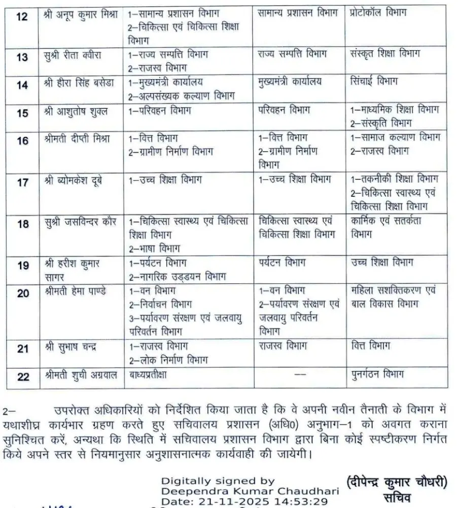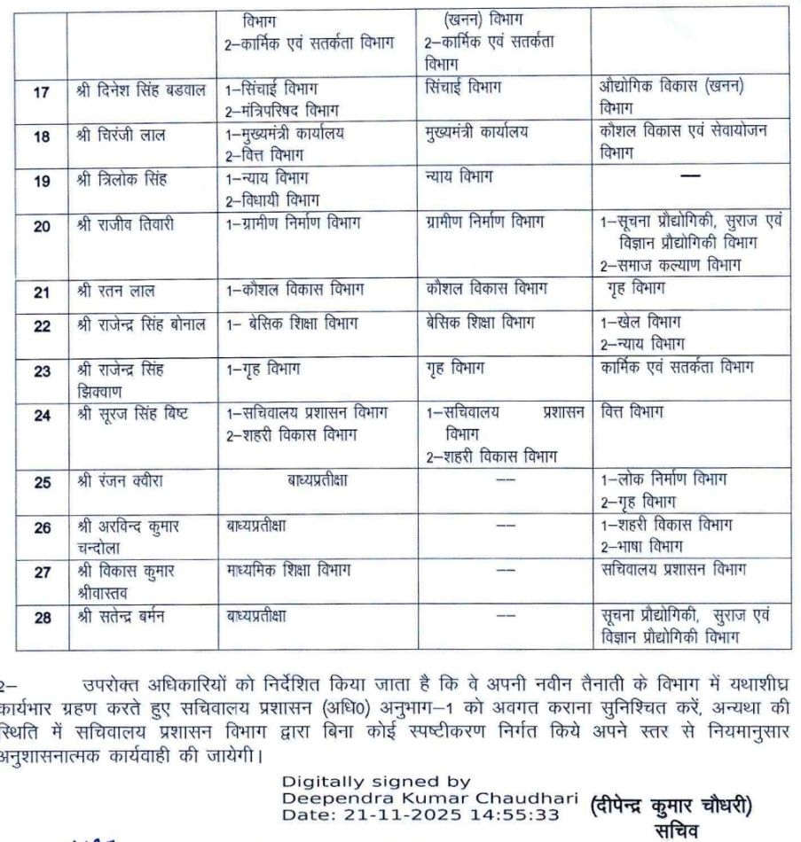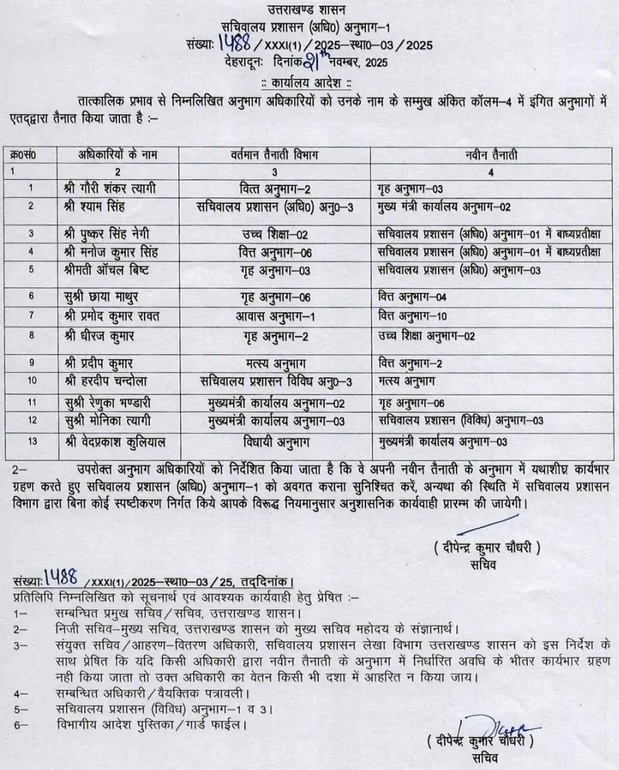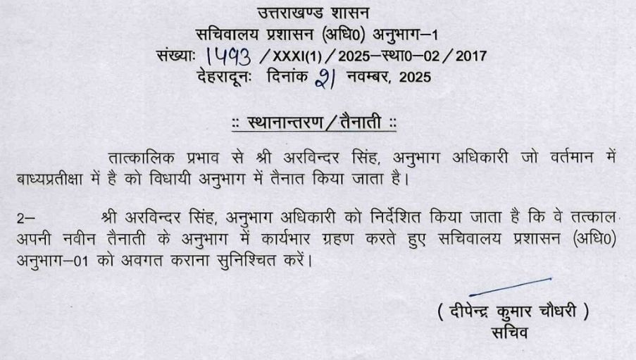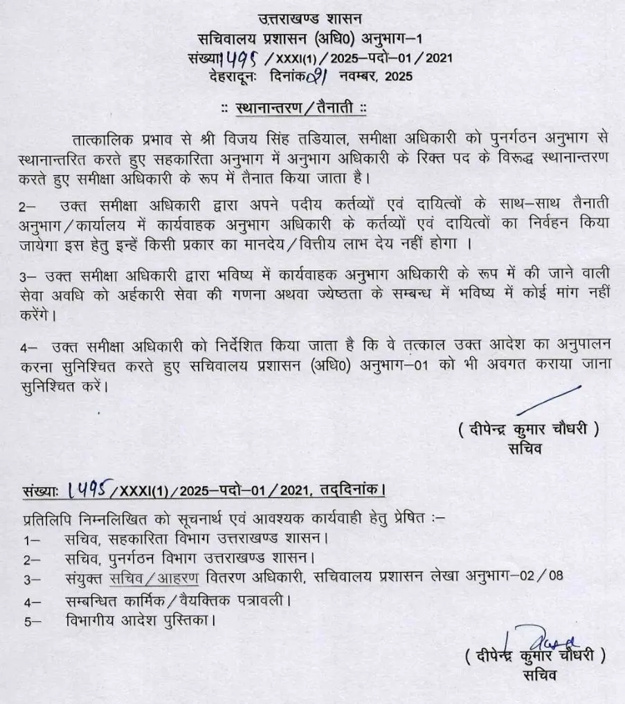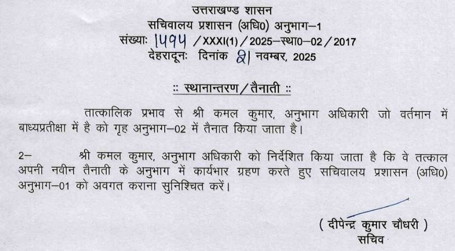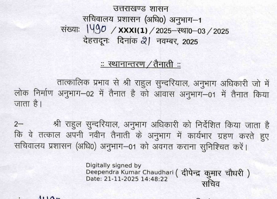 सचिवालय प्रशासन विभाग ने किये SO से लेकर संयुक्त सचिवों के बम्पर तबादले !! PrimeUttarakhand Posted on November 21, 2025November 21, 2025सचिवालय प्रशासन विभाग ने किये SO से लेकर संयुक्त सचिवों के बम्पर तबादले !!Share this… Facebook Twitter WhatsappShantanu BishtEditor By Shantanu Bisht