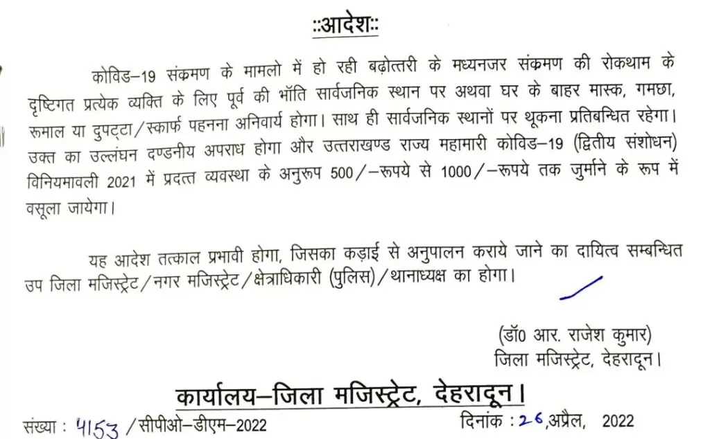 जनपद देहरादून में कोरोना संक्रमण के बढ़ते मामले देख जिलाधिकारी डॉ. आर राजेश कुमार ने आदेश जारी किया है कि शहर में बिना मास्क निकलने वालों से पांच सौ रुपये जुर्माना वसूला जाए।