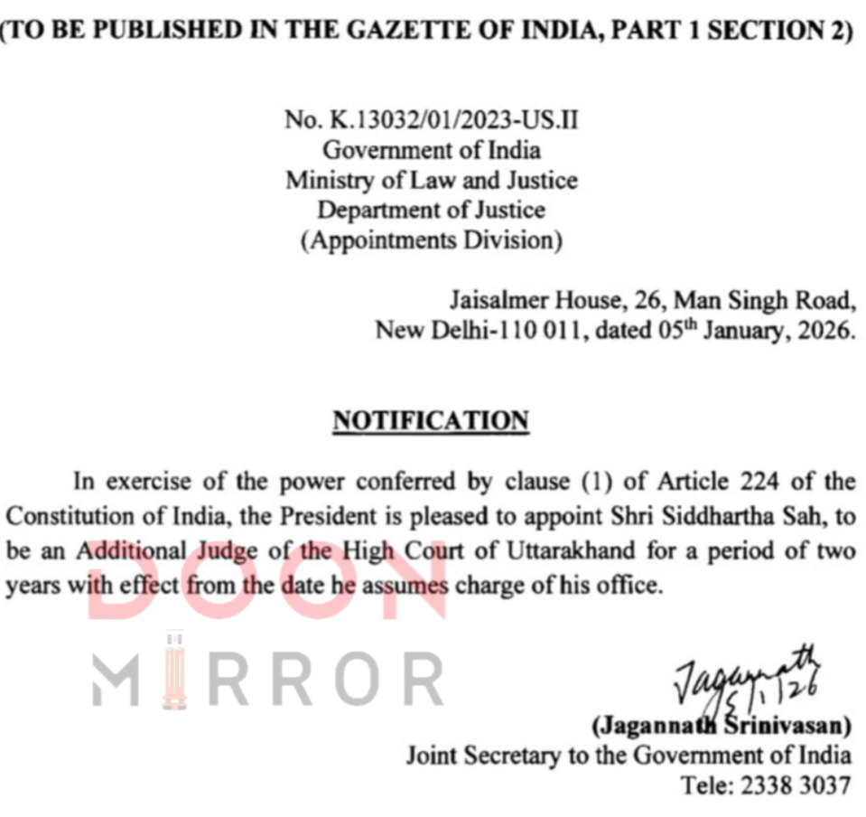 राष्ट्रपति की मंजूरी के बाद यह नियुक्ति भारतीय संविधान के अनुच्छेद 224(1) के तहत की गई है। सिद्धार्थ साह इससे पहले उत्तराखंड उच्च न्यायालय में अधिवक्ता के रूप में कार्यरत थे। न्यायिक क्षेत्र में उनका लंबा अनुभव रहा है। उनकी नियुक्ति की औपचारिक सूचना उत्तराखंड के राज्यपाल, मुख्यमंत्री और उच्च न्यायालय के मुख्य न्यायाधीश के सचिवालय को भेजी गई है।