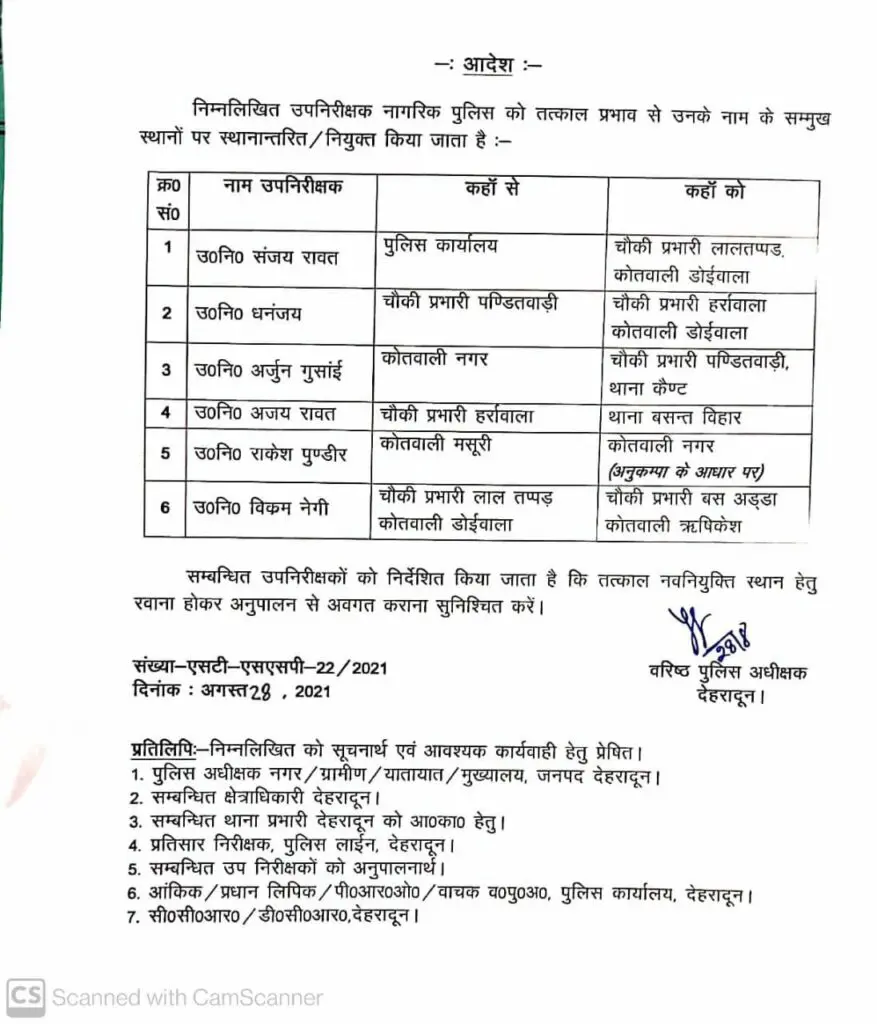 आज दिनांक 28/08/21 को वरिष्ठ पुलिस अधीक्षक देहरादून द्वारा निम्न उप निरीक्षकों के स्थानांतरण उनके नाम के सम्मुख अंकित स्थानों पर किये गये