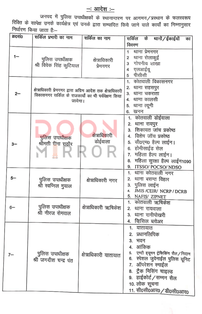एसएसपी देहरादून ने किए CO / DySP के कार्यक्षेत्रों में बदलाव !! AdministrationDehradun Posted on February 9, 2026February 9, 2026एसएसपी देहरादून ने किए CO / DySP के कार्यक्षेत्रों में बदलाव !!Share this… Facebook Twitter WhatsappShantanu BishtEditor By Shantanu Bisht