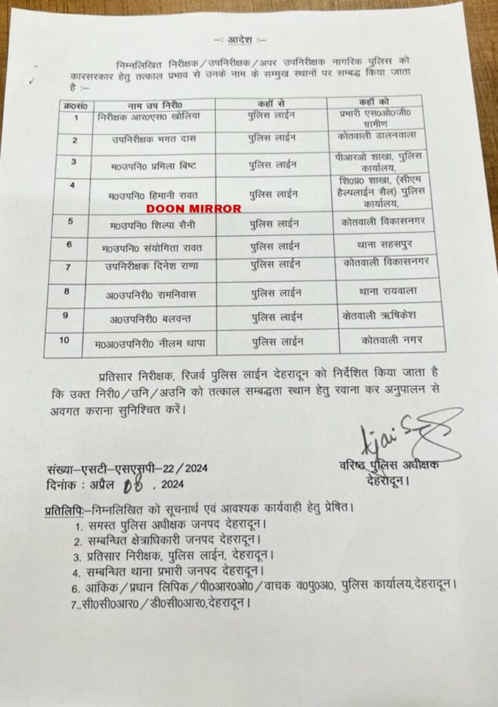 एसएसपी देहरादून ने किए निरीक्षक व दरोगाओं के तबादले !!
