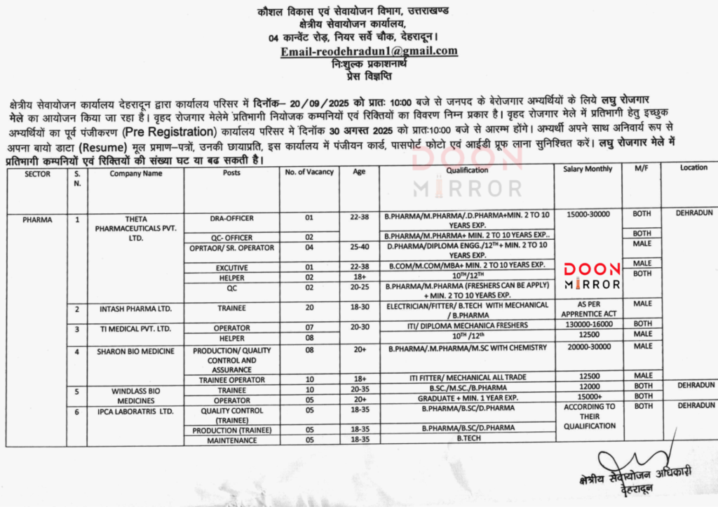 बेरोजगारों के लिए सुनहरा मौका, देहरादून में 20 सितंबर 2025 को लगने जा रहा रोजगार मेला !!