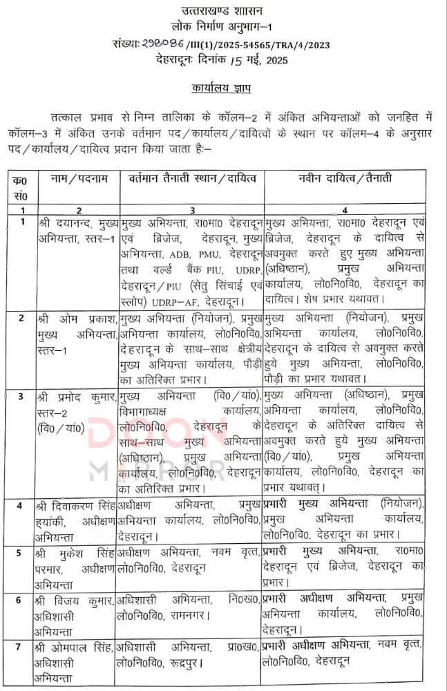 शासन ने किए PWD के इन अभियंताओं के तबादले, बड़े अधिकारियों की भी कुर्सी हिलाई गई !! PrimeUttarakhand Posted on May 15, 2025May 15, 2025शासन ने किए PWD के इन अभियंताओं के तबादले, इन बड़े अधिकारियों की भी कुर्सी हिलाई गई !!Share this… Facebook Twitter WhatsappShantanu BishtEditor By Shantanu Bisht