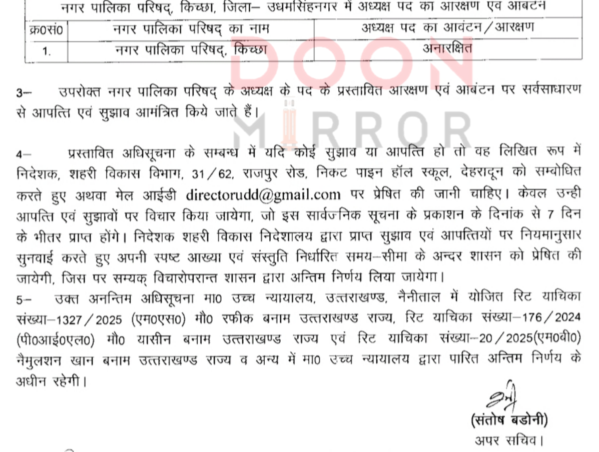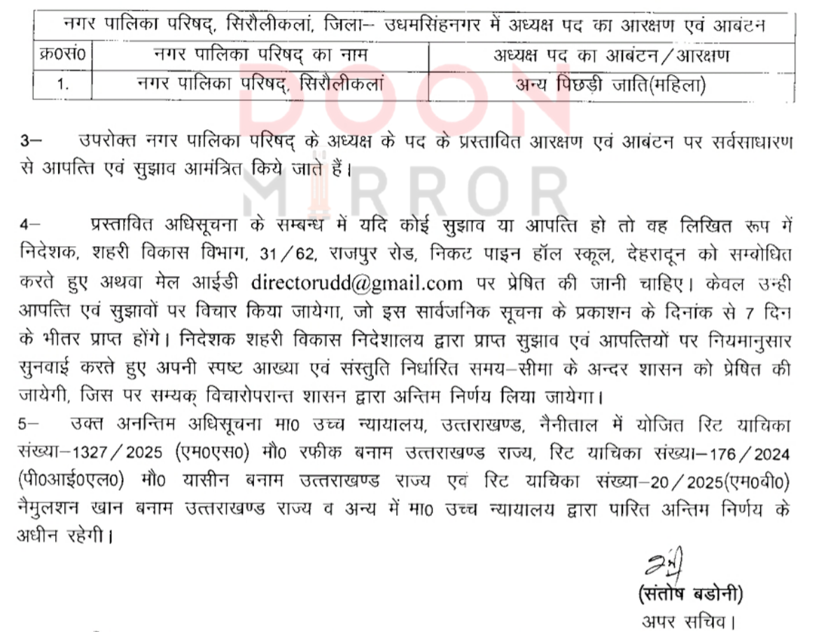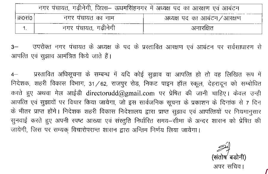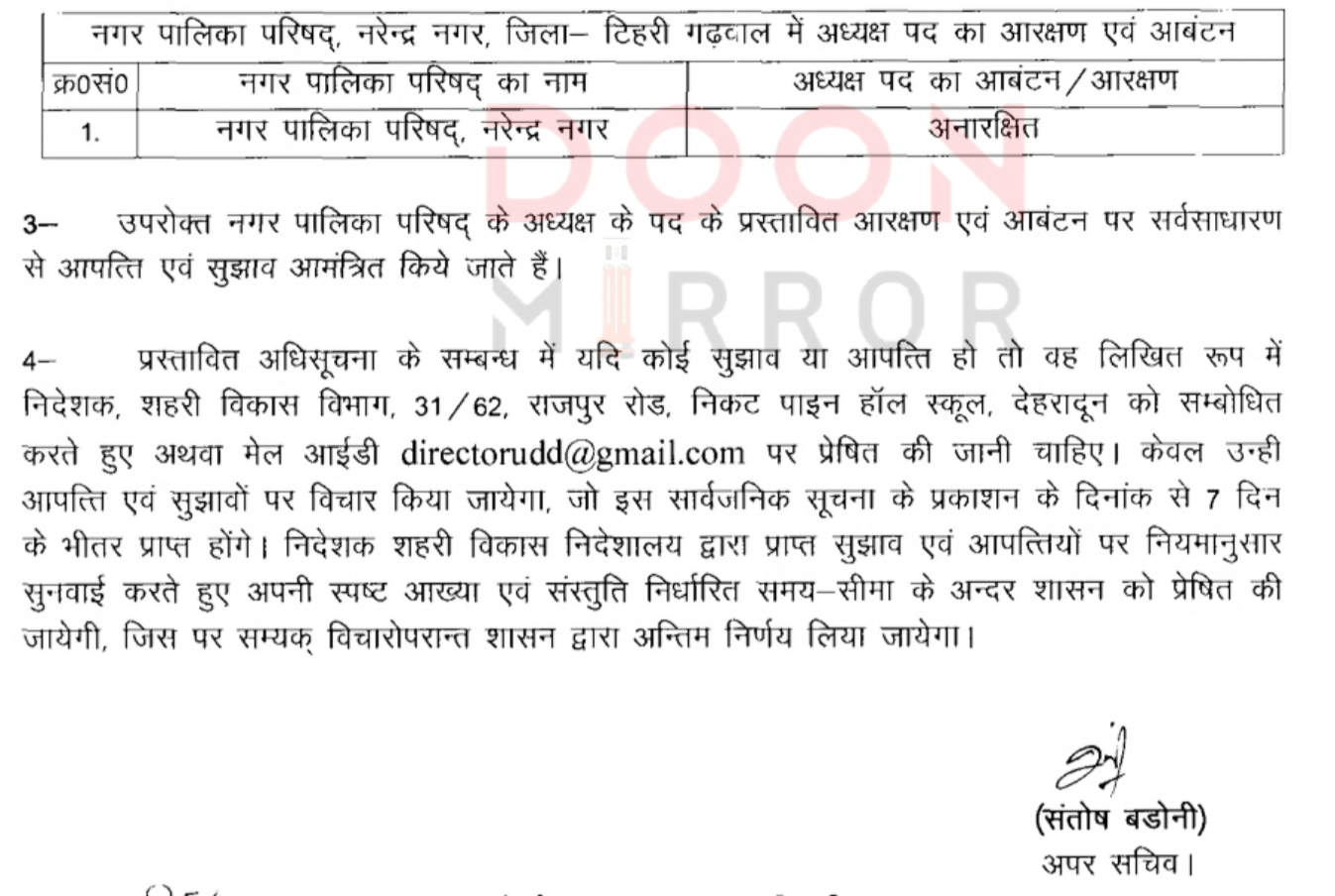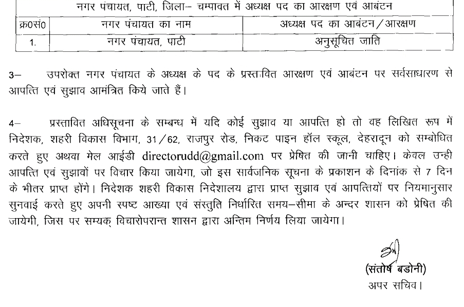 शासन ने जारी किया 5 नगर निकायों के अध्यक्ष पद पर अनतिम आरक्षण, आगामी 7 दिन के भीतर मांगी गई आपत्ति, बता दें कि नवीन गठन निकायों व नव परिसीमित नगर निकायों आगामी माह में होने है चुनाव !!