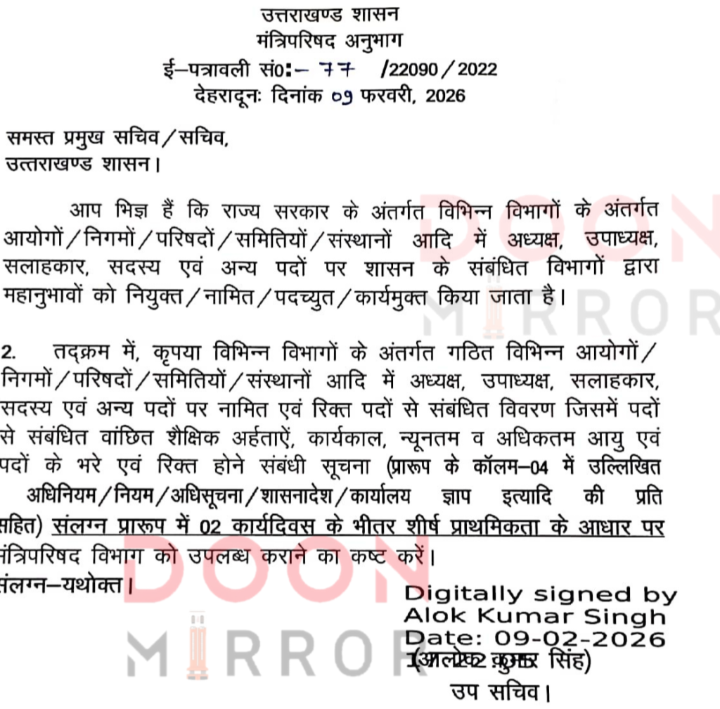 मंत्रिपरिषद अनुभाग की ओर से 9 फरवरी 2026 को जारी पत्र में सभी प्रमुख सचिवों और सचिवों को निर्देशित किया गया है कि वे अपने-अपने विभागों के अंतर्गत गठित आयोगों, निगमों, परिषदों, समितियों और संस्थानों में नामित एवं रिक्त पदों का पूरा विवरण “शीर्ष प्राथमिकता” के आधार दो कार्यदिवस के भीतर मंत्रिपरिषद विभाग को उपलब्ध कराई जाए। इसमें संबंधित पदों की शैक्षिक योग्यता, कार्यकाल, न्यूनतम व अधिकतम आयु सीमा तथा वर्तमान में भरे और रिक्त पदों की स्थिति स्पष्ट करने को कहा गया है।