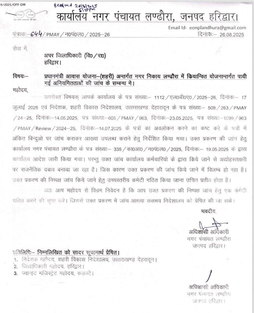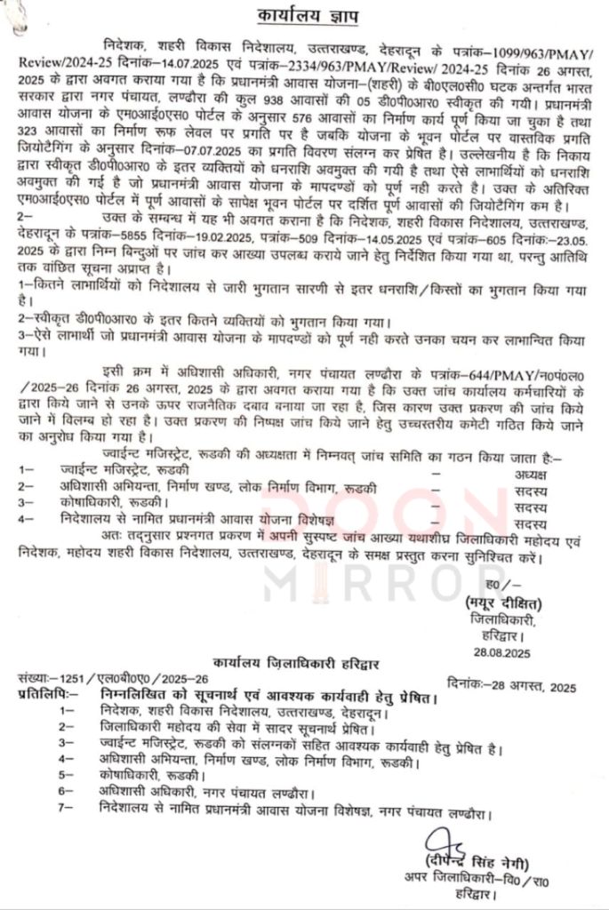प्रधानमंत्री आवास योजना (शहरी) के अंतर्गत नगर पंचायत लंढोरा में आवासों के निर्माण को लेकर अनियमितताओं की शिकायतों के बाद जिला प्रशासन ने मामले की जांच के लिए चार सदस्यीय समिति का गठन किया है। जिलाधिकारी मयूर दीक्षित ने आदेश जारी कर कहा कि योजना के तहत स्वीकृत आवासों के निर्माण में गड़बड़ी की आशंका को देखते हुए यह कदम उठाया गया है।