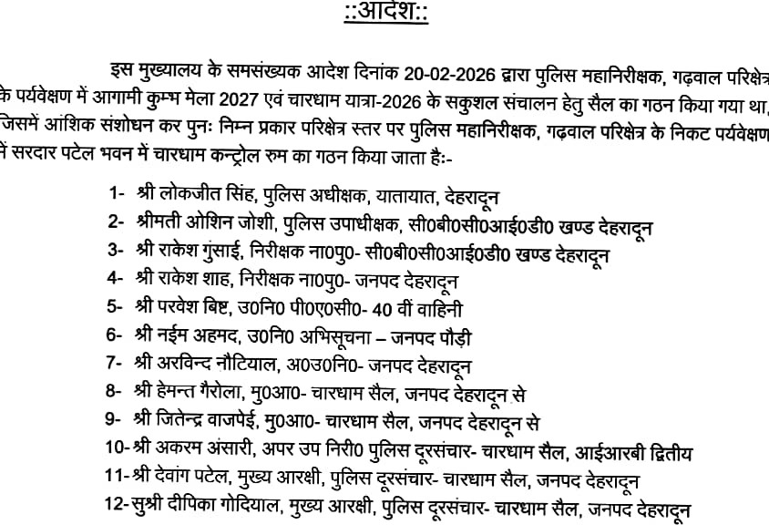 पुलिस मुख्यालय के आदेश के तहत पुलिस महानिरीक्षक, गढ़वाल परिक्षेत्र के पर्यवेक्षण में चारधाम यात्रा-2026 एवं कुम्भ मेला-2027 के सुचारु संचालन हेतु गठित सेल में आंशिक संशोधन किया गया है। संशोधित आदेश के अनुसार, सरदार पटेल भवन स्थित चारधाम कंट्रोल रूम को और अधिक सुदृढ़ करते हुए अधिकारियों की तैनाती की गई है।