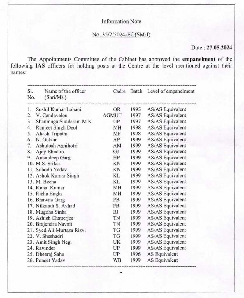 जिसमे 1995 से लेकर 1999 तक के 26 आईएएस अधिकारियों को किया गया AS / अपर सचिव रैंक पर एम्पनलमेंट !!