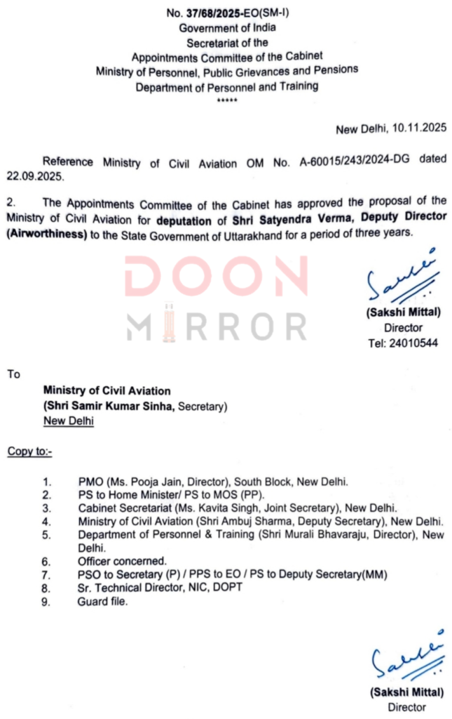 केंद्र सरकार ने नागरिक उद्य्यन मंत्रालय के अंतर्गत DGCA में डिप्टी डायरेक्टर के पद पर तैनात सत्येंद्र वर्मा को प्रतिनियुक्ति पर 3 वर्ष के लिए उत्तराखंड भेजा है। बता दें कि सत्येंद्र वर्मा लेवल 12 के अधिकारी हैं। जो कि अब DOPT के आदेश के क्रम में अगले 3 वर्ष के लिए उत्तराखंड में तैनात रहेंगे।