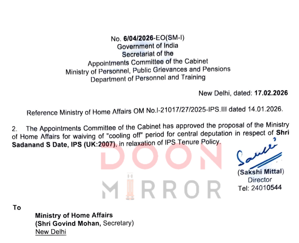 उत्तराखंड कैडर के IPS अधिकारी IG सदानंद दाते को आखिरकार MHA ने कूलिंग पीरियड में शिथलीकरण देने का निर्णय ले लिया है। बता दें कि एक IPS अपने मूल कैडर से दूर प्रतिनियुक्ति पर अधिकतम 7 साल के लिए ही बाहर रह सकता है, उसके उपरांत उसे कूलिंग पीरियड के लिए मूल कैडर में वापस आना पड़ता है।